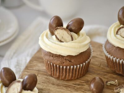 Saftige Schokobon Muffins mit Schokobon Kern und cremigem Mascarpone Frosting. Einfaches Rezept mit Schritt für Schritt Anleitung, perfekt für Ostern...