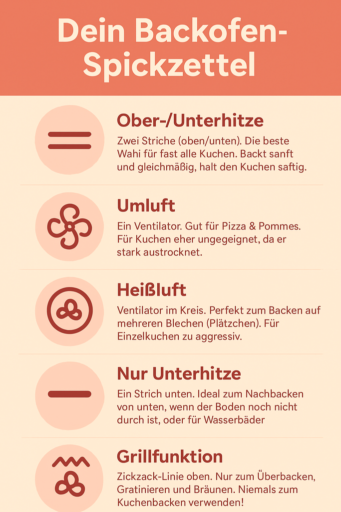 Um die richtige Wahl zu treffen, müssen wir kurz verstehen, was hinter den Symbolen passiert. Denk an deinen Ofen wie an ein kleines Spa für deinen Kuchen – die Frage ist nur: sanfte Sauna oder stürmischer Föhn?