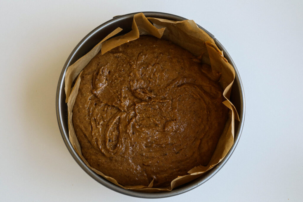 Jetzt mischst du das Vollkornmehl mit Backpulver, Natron, gemahlenen Mandeln und einer guten Portion Zimt. Den Apfelessig gibst du da auch mit rein und dann in die Öl-Kokoszuckermischung geben. Gut verrühren, bis ein geschmeidiger Teig entsteht. Und denn gibst du dann in die vorbereitete Springform: