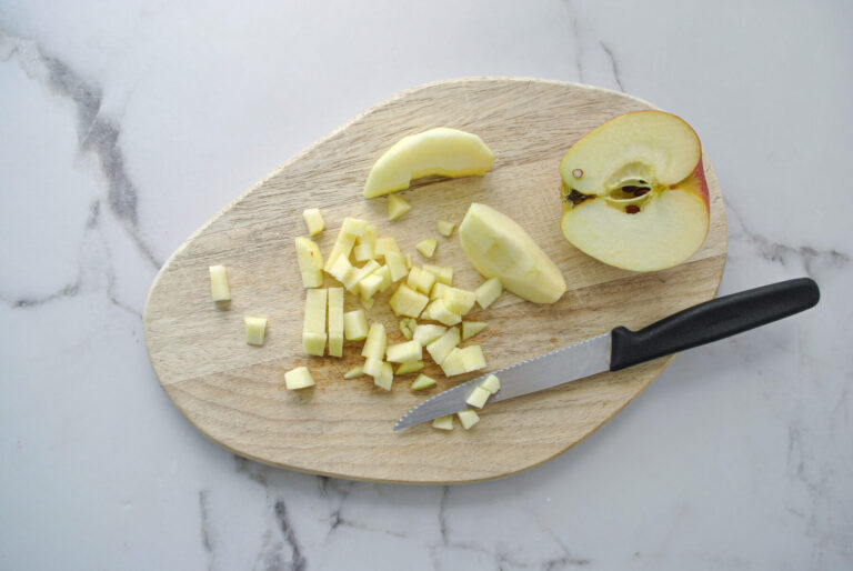 Den Apfel schälen und das Gehäuse entfernen und den Apfel in kleine Stücke schneiden.