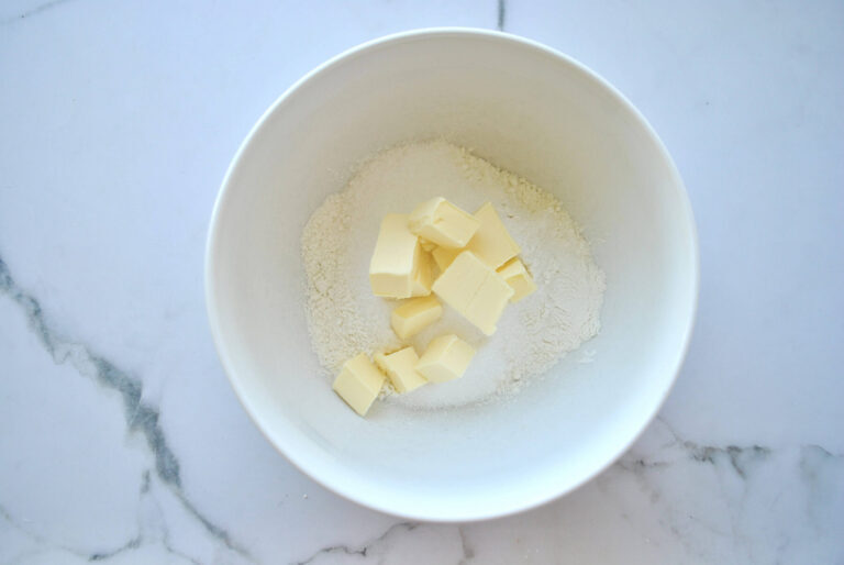 Danach bereiten wir uns die Butterstreusel zu. Dazu gibst du die kalte gewürfelte Butter zusammen mit dem Zucker und dem Mehl in eine Schüssel und knetest die Zutaten zügig von Hand zu einem krümeligen Teig.