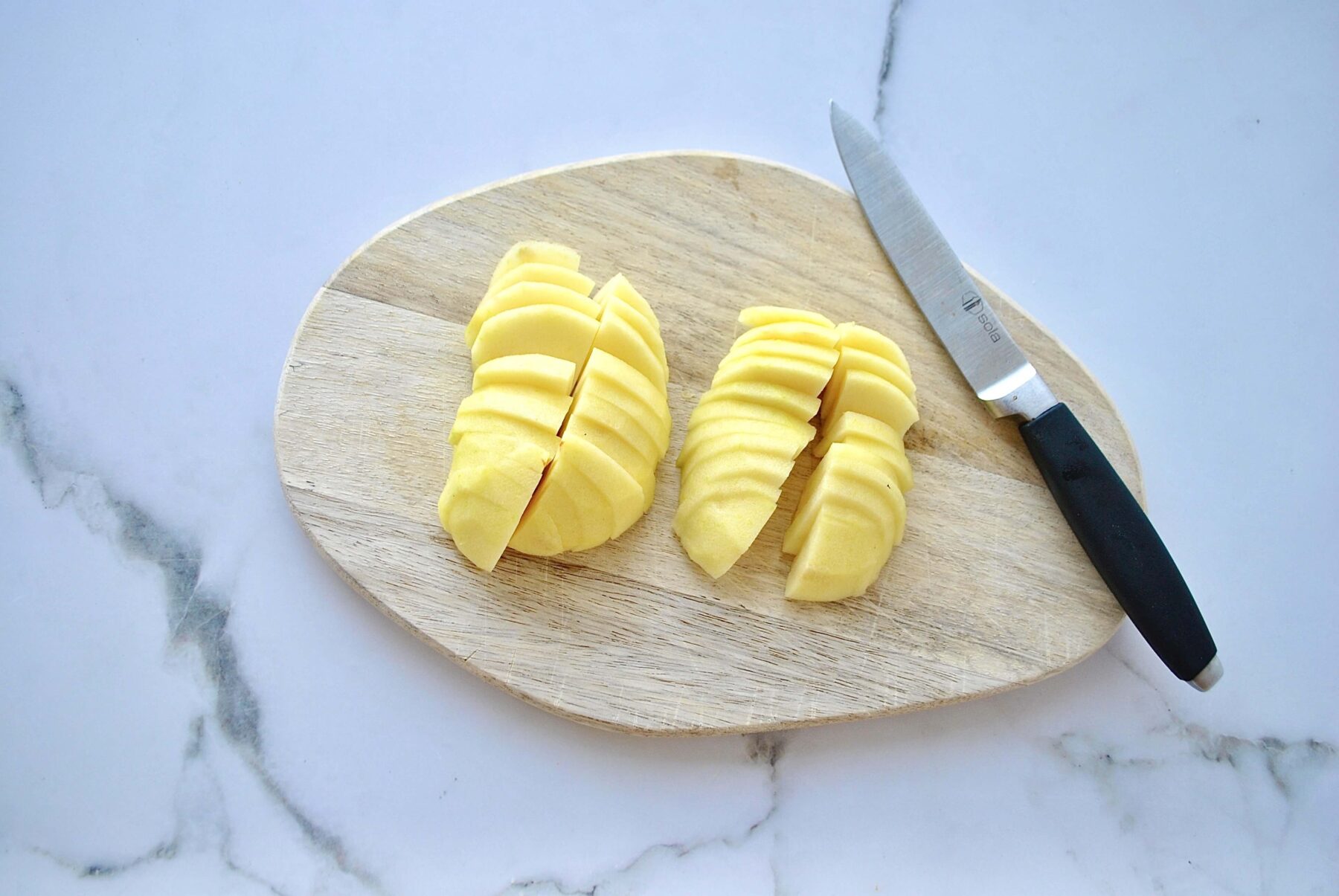 Backäpfel – Welche Apfelsorten eigenen sich zum Backen?Die Apfel hälften in dünne Scheiben schneiden und nochmals halbieren.