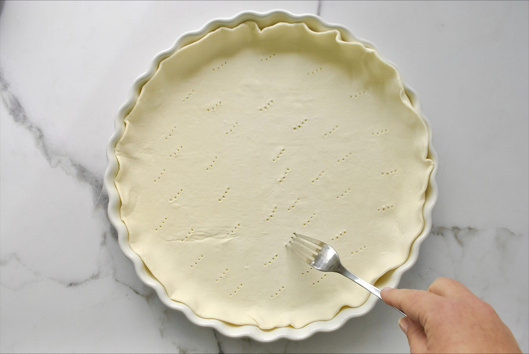 Rolle den Blätterteig aus und lege ihn in eine passende runde Backform.