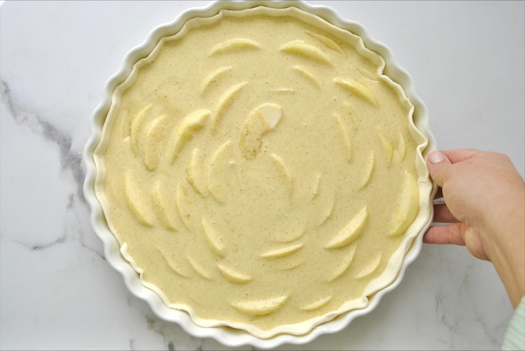 Giesse den Vanilleguss nun vorsichtig und gleichmässig über die Apfelstücke und gib die Tarte auf die unterste Rille in den vorgeheizten Backofen