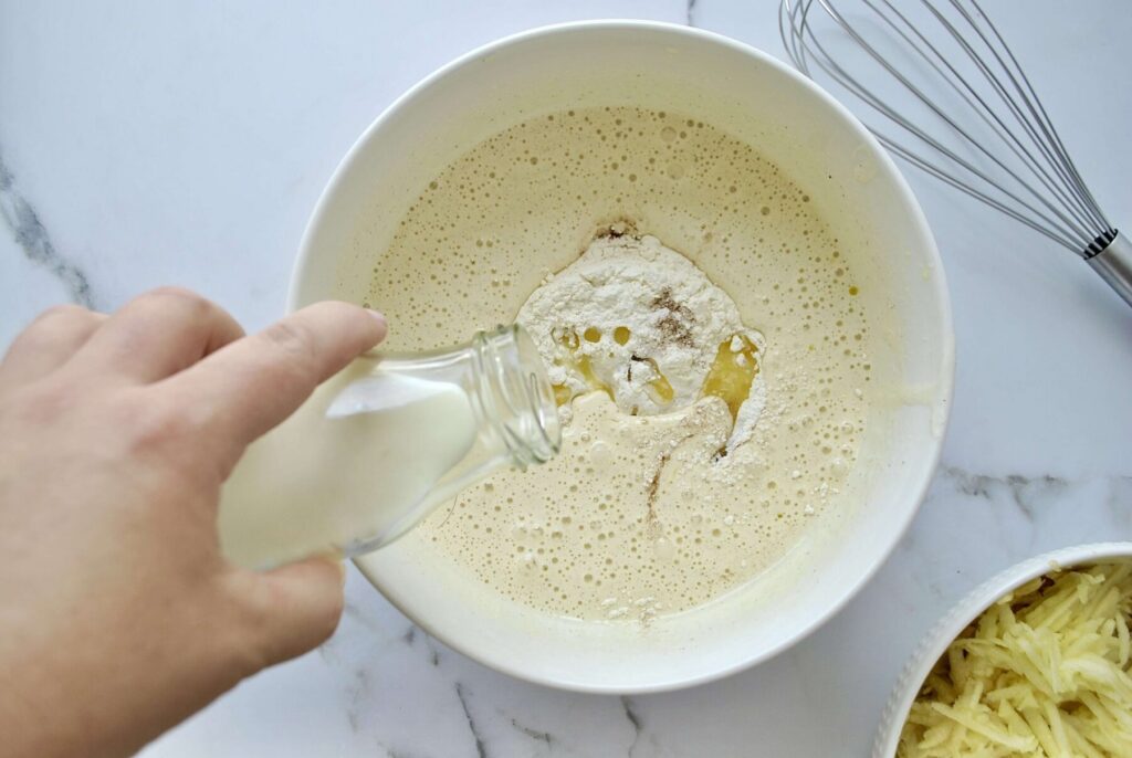 Anschliessend kannst du das Mehl mit dem Backpulver und Zimt mischen und zusammen mit der flüssigen Butter und der Milch zum Teig geben. Mit einem Schneebesen von Hand vorsichtig den Teig vermengen. Der Teig soll schön luftig bleiben. Also auf keinen Fall kräftig rühren.