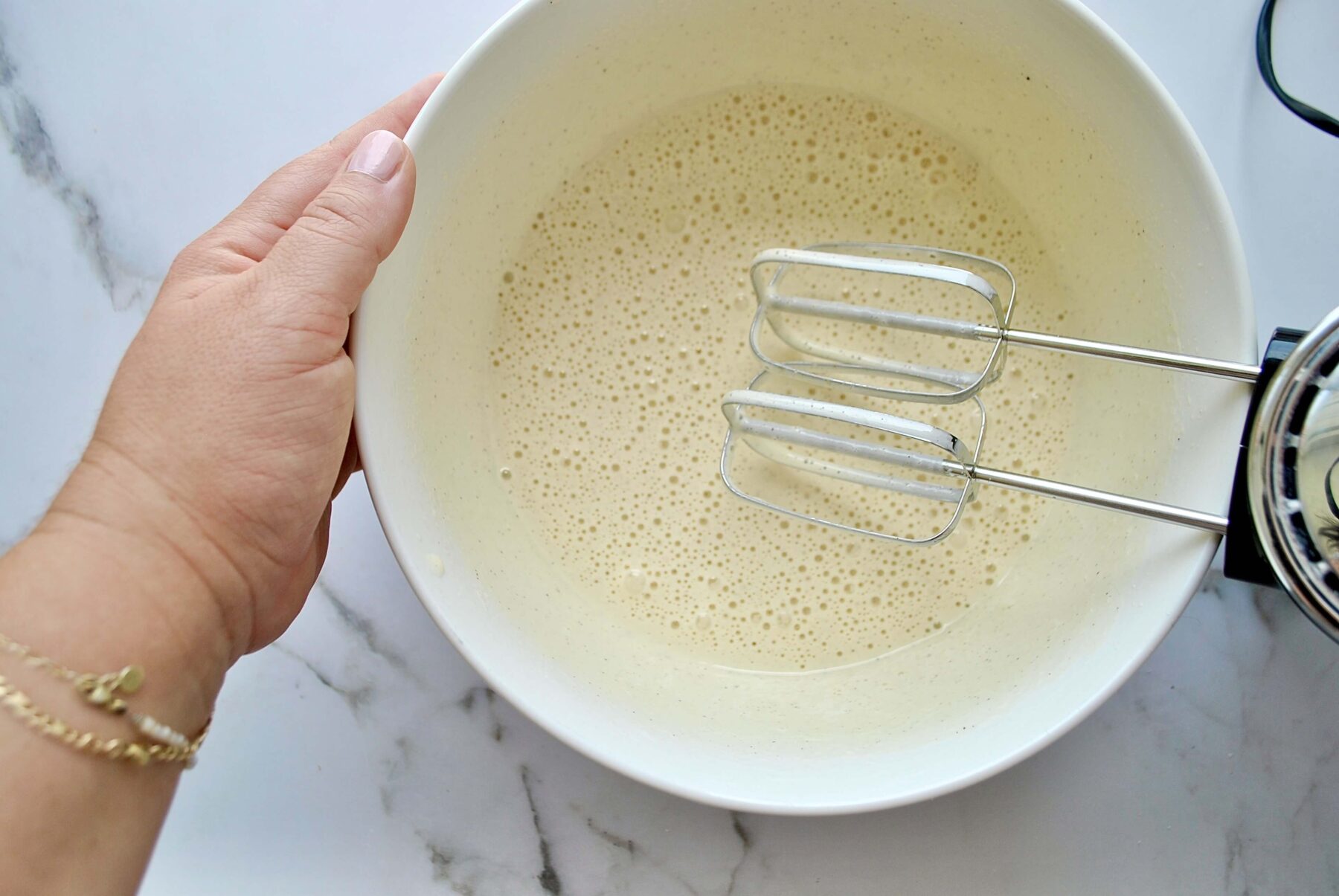 In einer separaten Schüssel kannst Du die Eier zusammen mit dem Zucker und Vanillezucker mit einem Handrührgerät für ca. 5 Minuten kräftig aufschlagen bis eine helle und schaumige Masse entsteht.