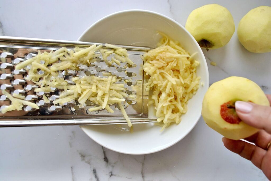Die Äpfel schälen und mit einer Reibe fein raspeln. Geht natürlich auch mit einer Küchenmaschine. Dann auch das Gehäuse der Äpfel entfernen. Anschließend die geraspelten Äpfel direkt mit Zitronensaft beträufeln damit sie nicht braun werden.