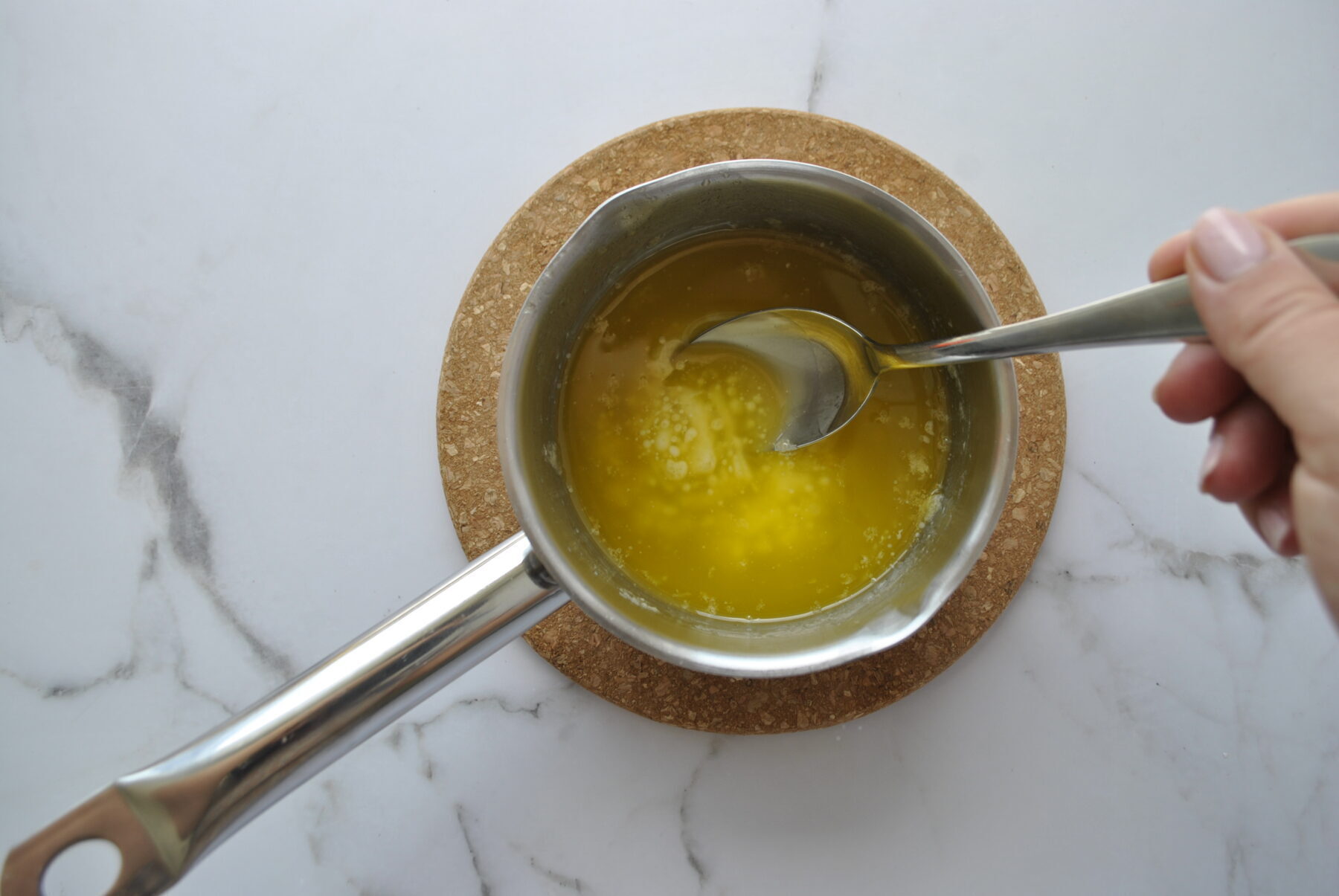 Butter in einer Pfanne bei niedriger Temperatur zergehen lassen. Anschließend etwas abkühlen lassen.