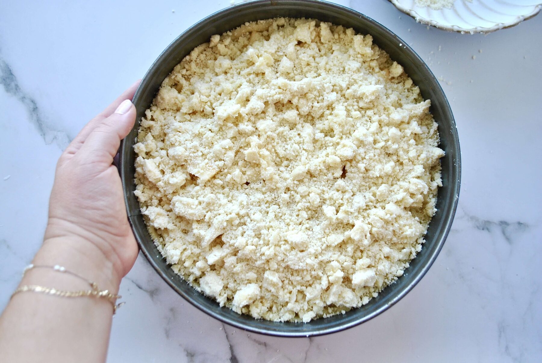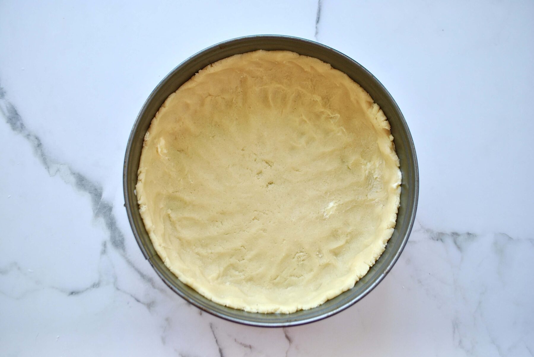 Danach gibst du den Teig in die Springform und drückst ihn gleichmäßig von Hand in die Form und ca. 4cm am Rand hoch.