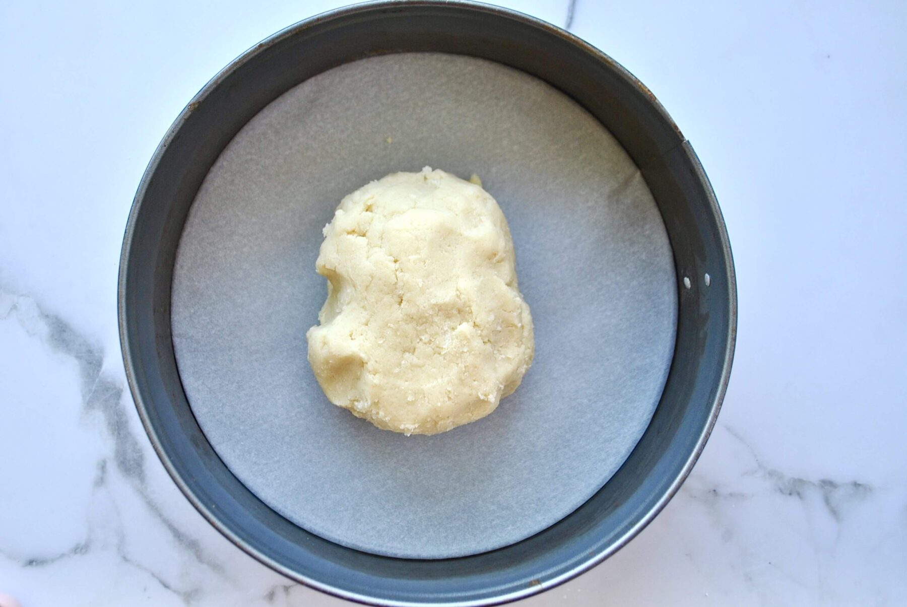 Den Springformboden mit Backpapier auslegen und den Teig in die Springform geben. Mit der flachen Hand gleichmässig andrücken und am Rand ca. 4 cm hoch drücken.