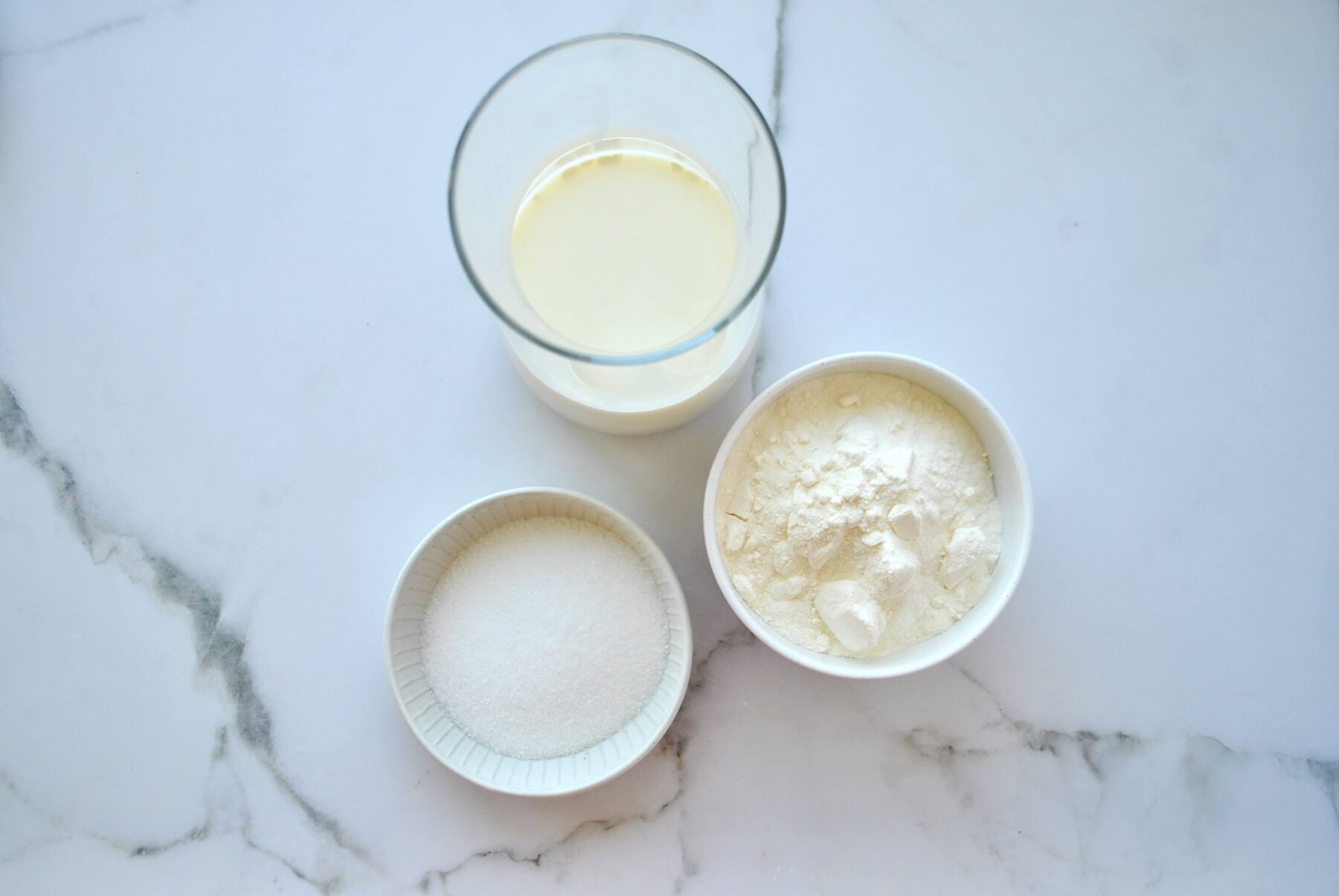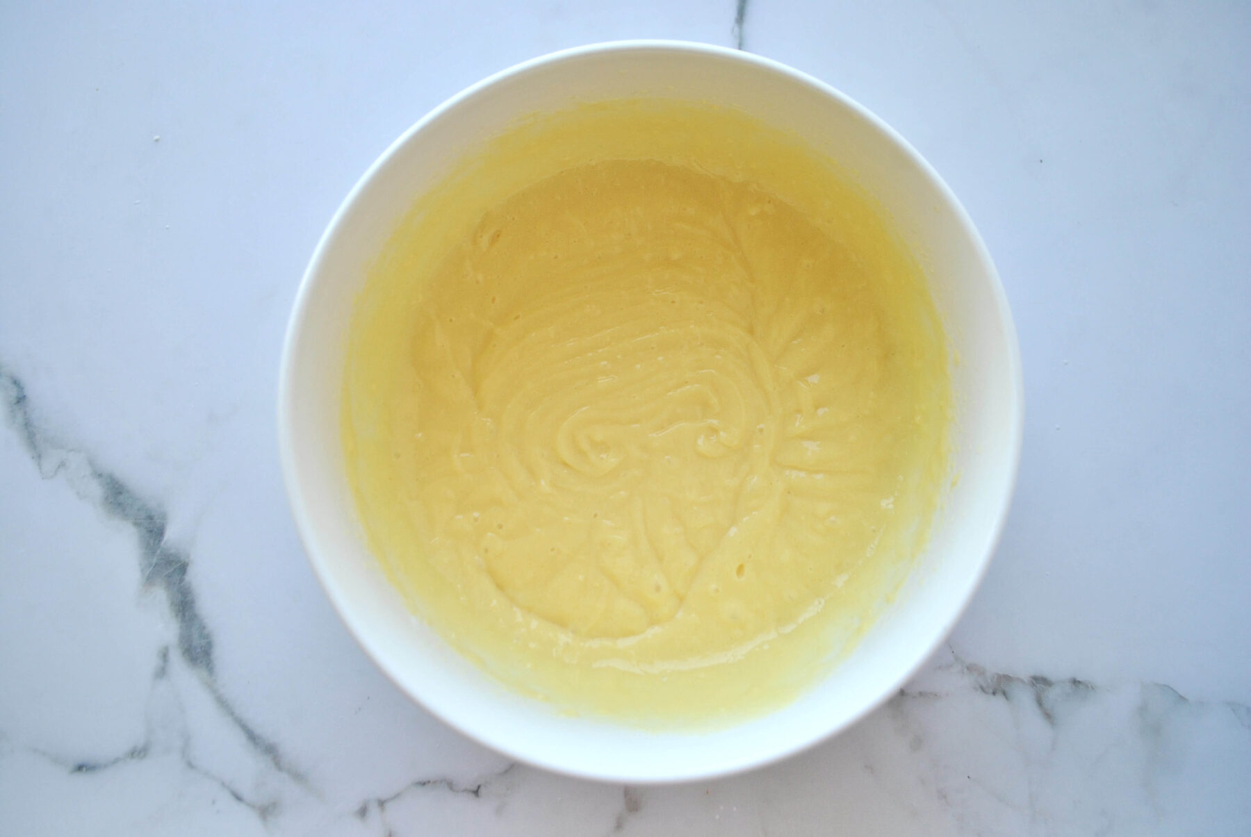 Nun bereiten wir den Vanillepudding zu. Dafür erwärmst du die Milch zusammen mit dem Zucker in einem Topf. Anschliessend gibst du das Vanillepuddingpulver hinzu und lässt ihn kurz aufkochen unter ständigem Rühren mit einem Schneebesen bis er andickt. Danach deckst du ihn am besten mit einer Klarsichtfolie ab und lässt ihn etwas auskühlen.
