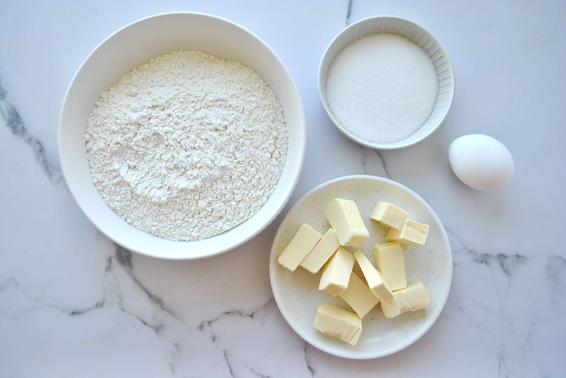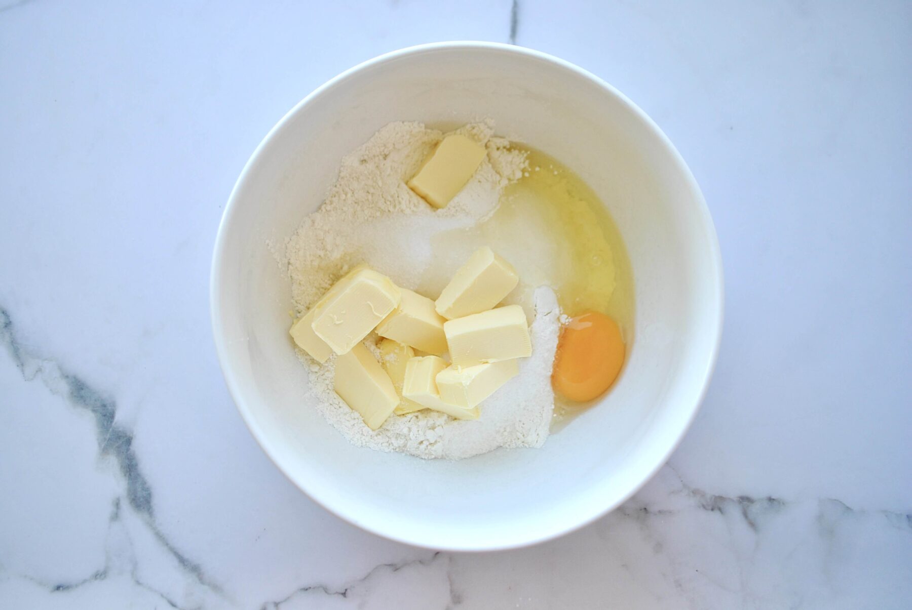 Zuerst bereiten wir den Mürbeteig zu. Dazu gibst du alle Zutaten wie Mehl, Zucker, Salz, Ei und kalte Butter in eine Schüssel und vermengst sie von Hand zügig bis ein glatter Teig entsteht.