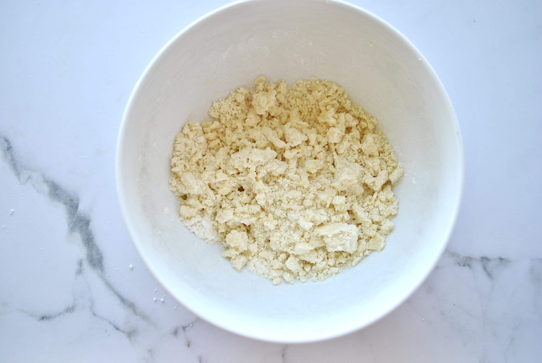 Vermenge die Zutaten von Hand zu einem krümeligen Teig. Das schaut dann am Ende etwa so aus.