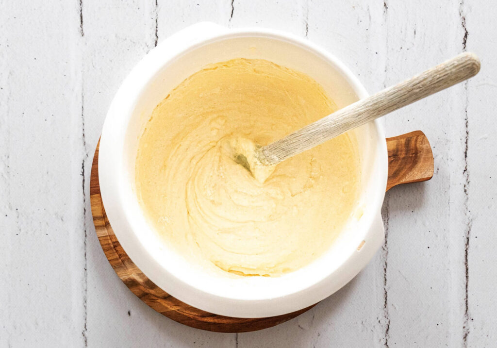 Es ist wichtig, dies zügig zu tun und dabei die Masse glatt zu rühren, damit sich die Eier gleichmäßig mit der Butter verbinden und die eingeschlagene Luft enthalten bleibt. So wird der Rührteig schön geschmeidig und luftig, was später zu einem besonders zarten Apfelmuskuchen vom Blech führt.
