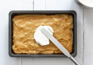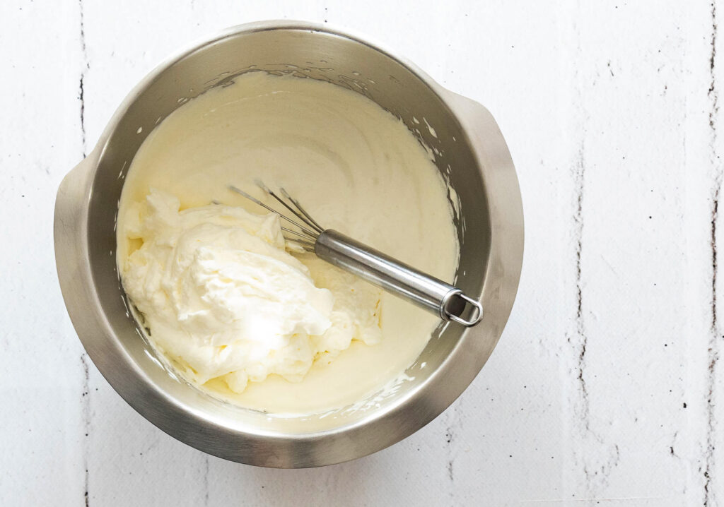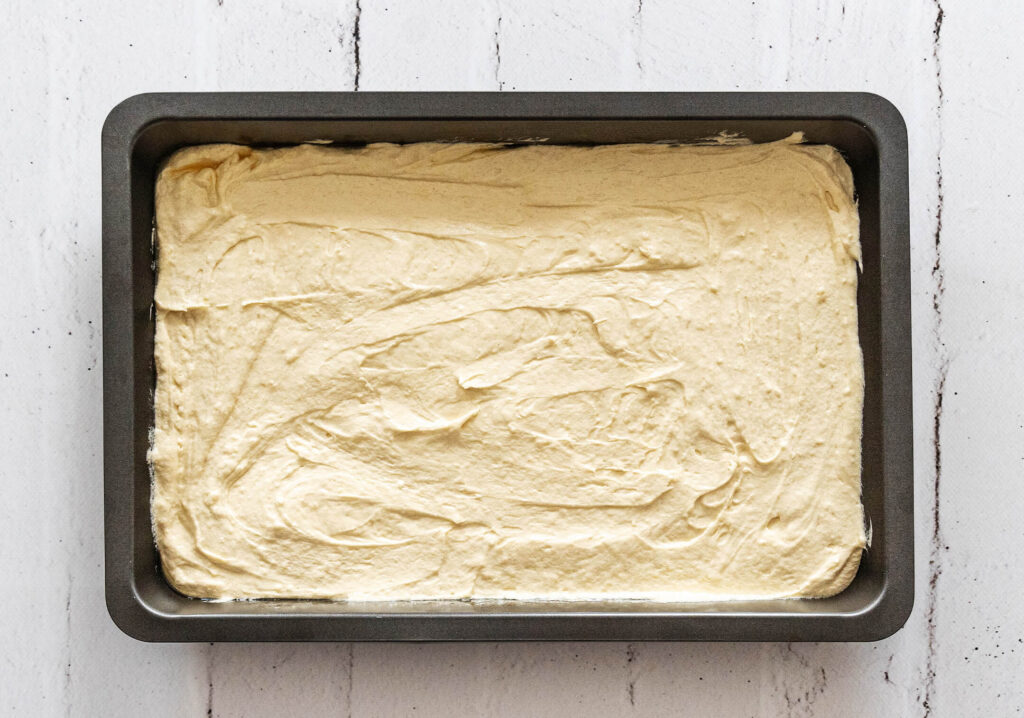 Während der Kuchen im Ofen ist, kannst du die Sahne vorbereiten. Schlage sie zusammen mit 40 g Zucker, 2 Teelöffeln Vanilleextrakt und San Apart steif. San Apart ist ein spezielles Bindemittel, das dabei hilft, die Sahne stabil zu halten, sodass sie ihre feste Konsistenz besser beibehält, sobald man den Schmand unterhebt. Nachdem die Sahne steif geschlagen ist, schlage den Schmand kurz auf, um ihn cremig zu machen, und hebe ihn vorsichtig unter die Sahne. Dadurch entsteht eine luftige und zugleich cremige Schicht, die später auf den Kuchen kommt. Stell die Mischung dann beiseite, bis der Kuchen vollständig abgekühlt ist.