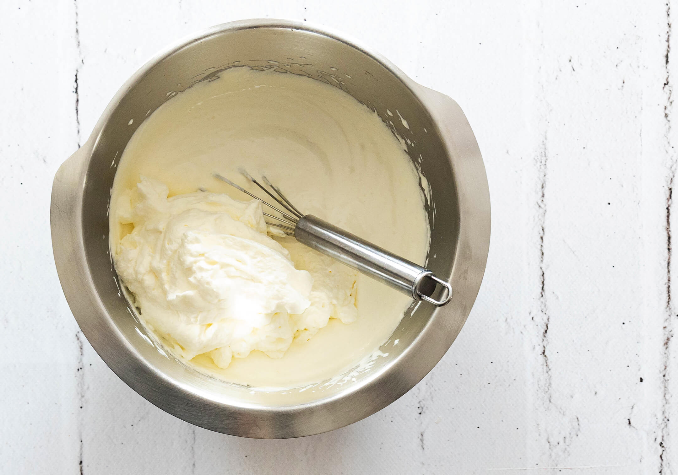 In der Zwischenzeit die Sahne zusammen mit 40 g Zucker, 2 TL Vanilleextrakt und dem San Apart steif schlagen. Den Schmand kurz aufschlagen und unter die Sahne heben. Anschließend alles beiseitestellen.