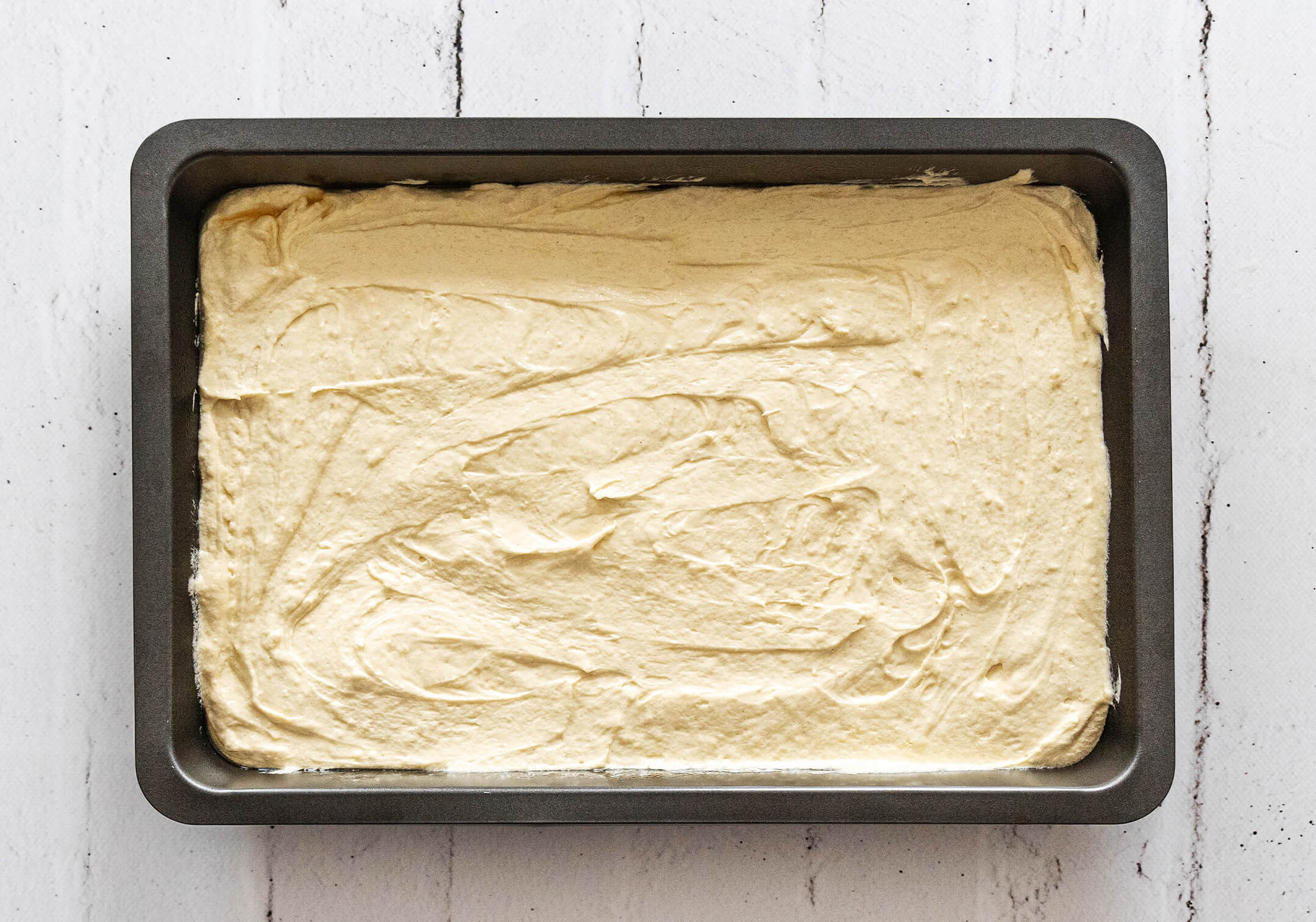 Den Teig anschließend auf ein mit Backtrennspray gefettetes Backblech geben und im vorgeheizten Backofen für 35 Minuten backen. Danach den Ofen abschalten, den Kuchen noch 3-4 Minuten im Ofen ruhen lassen, herausnehmen und abkühlen lassen.