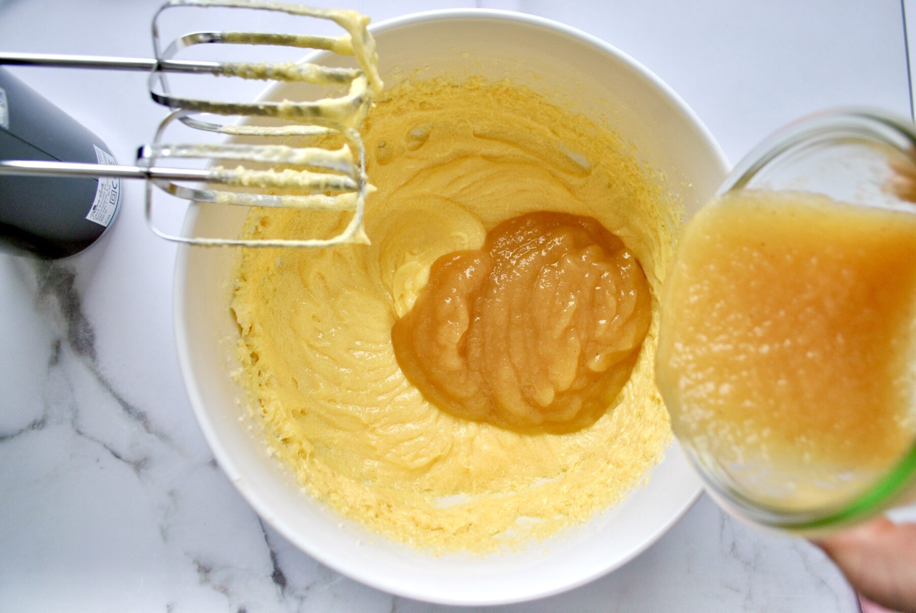 Das Apfelmus gibst du nun ebenfalls dazu und vermengst es unter den Teig.