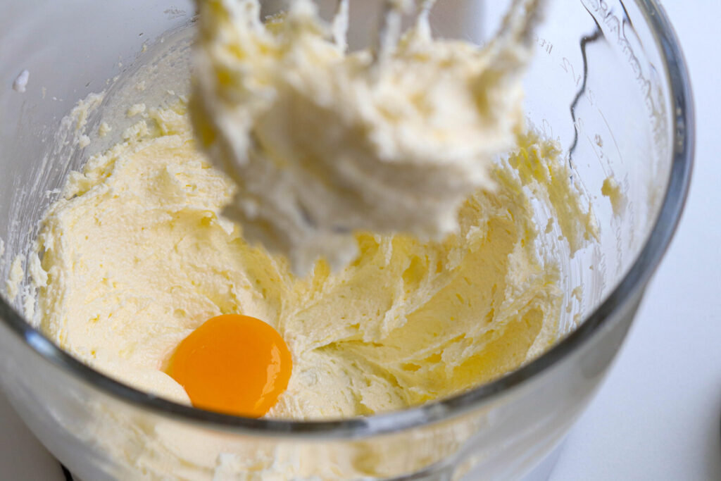 Gib die weiche Butter, Zucker und Vanillezucker in eine Schüssel und schlage sie hell-cremig auf. Das dauert ca. 4-5 Minuten.