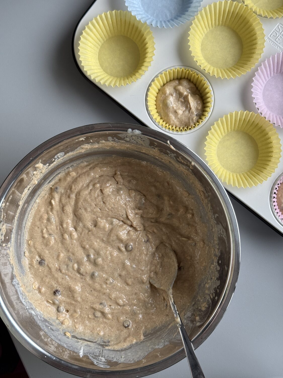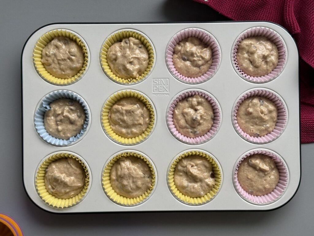 Die Muffins Formen zu 3/4 befüllen. Falls Teig übrig bleibt, kannst du diese in zusätzlichen Muffins Förmchen oder auch kleine Kuchen Formen geben.