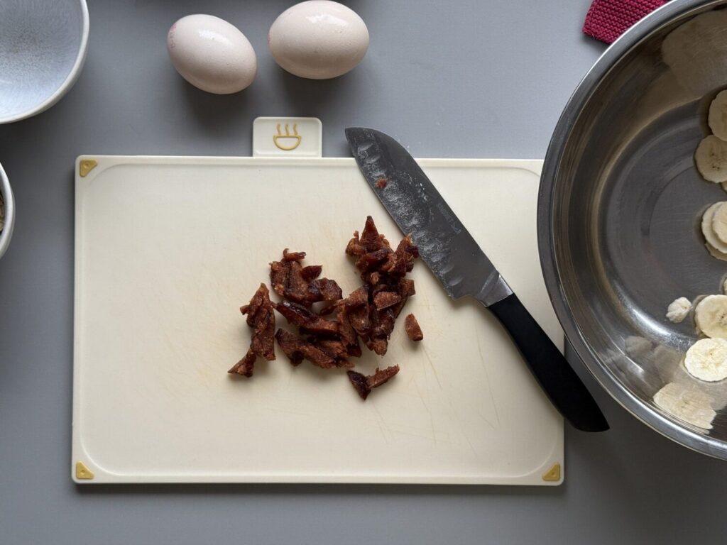 150 g Banane entsprechen 1 bis 2 Bananen, je nachdem wie groß sie sind. Die Bananen wird geschält und in dünnen Scheiben geschnitten, damit wir sie im Teig gut vermengen können.