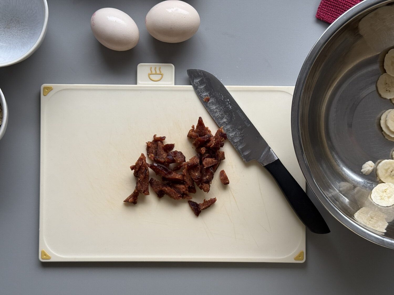 Bananen dünn schneiden und Datteln fein hacken.