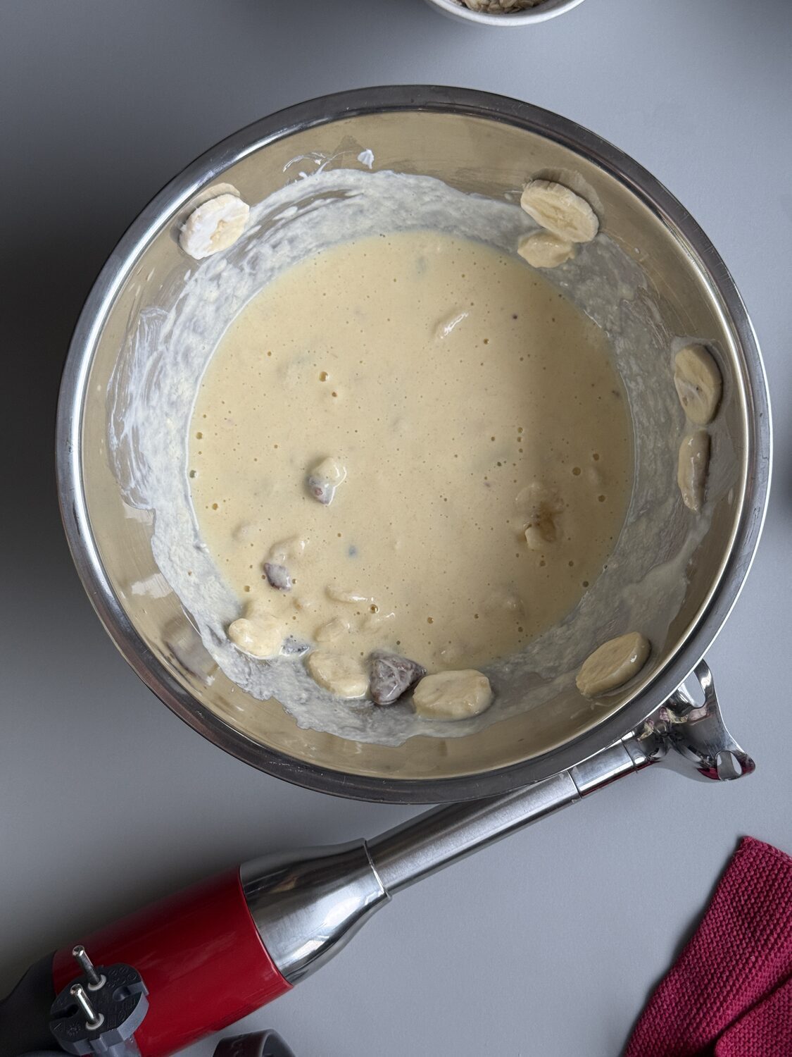 Sind die Bananen und/oder Datteln noch zu grob im Teig? Dann püriere sie fein mit einem Stabmixer.