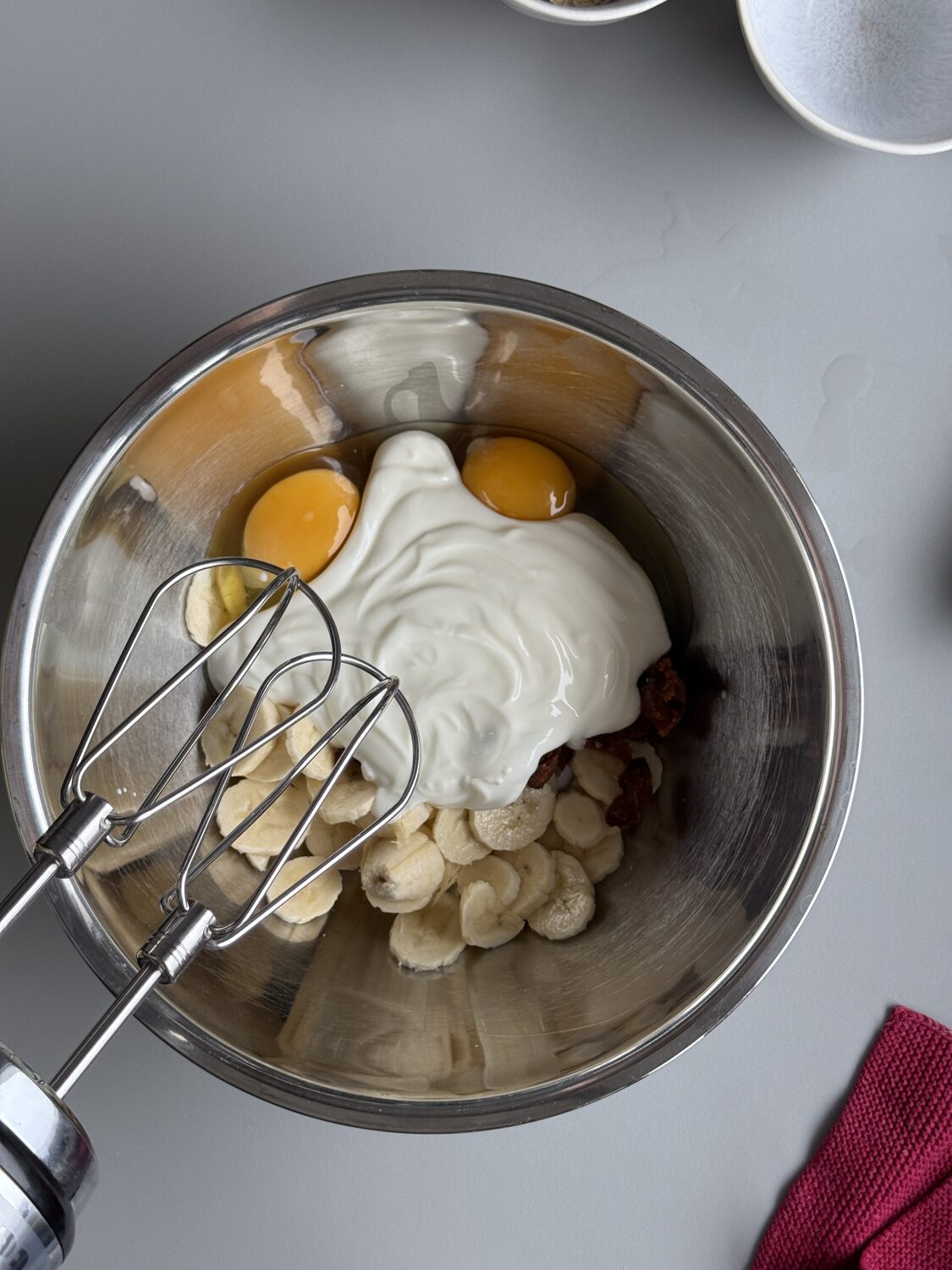 In einer Schale Bananen, Datteln, Eier und Joghurt mit dem Handrührgerät gut vermischen.