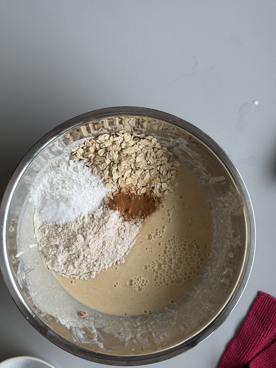 Jetzt kommen die trockene Zutaten dazu: Mehl, Haferflocken und Backpulver untermengen und gut rühren. Wenn du magst, kannst du auch ein wenig Zimt, Vanille oder andere Aromen dazugeben. Ich habe hier 1/2 TL Zimtpulver verwendet.