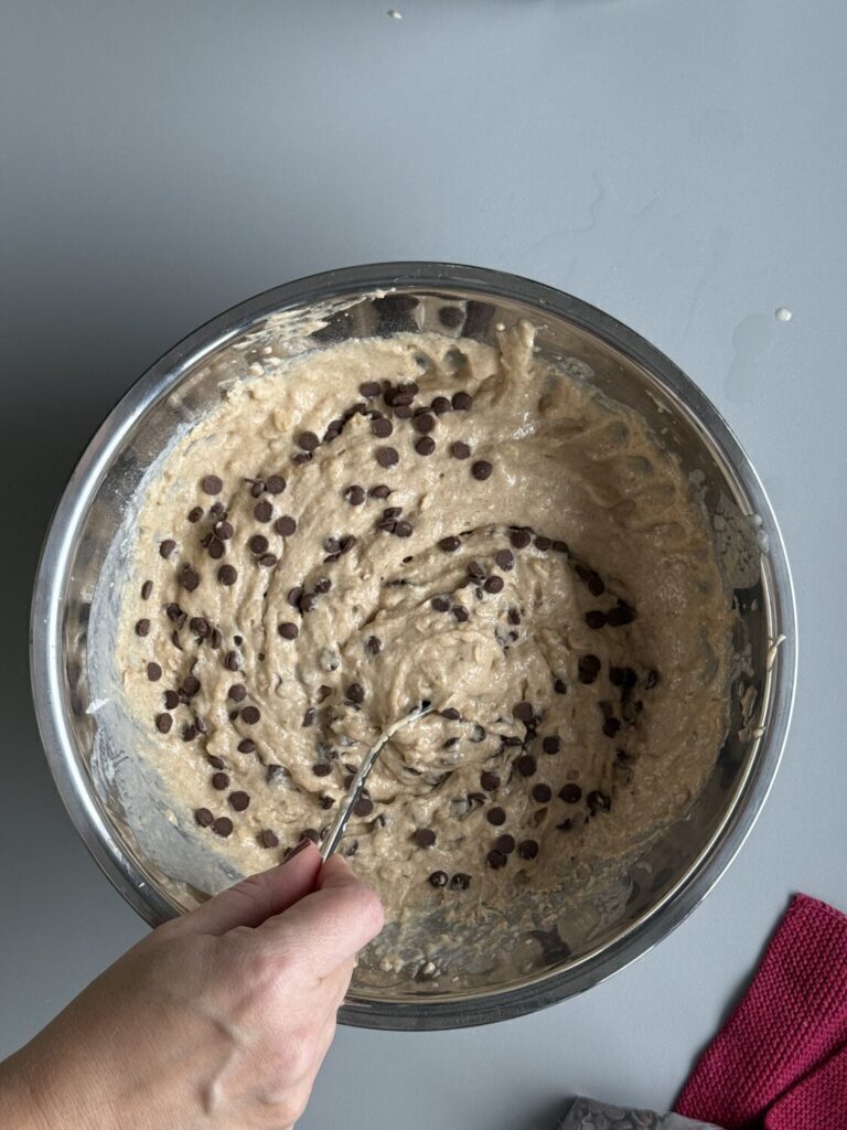 Am Schluss kannst du Heidelbeeren, Schoko Stücken oder Nüssen, Beeren, Obst nach Wahl mit einem Löffel vorsichtig untermengen.