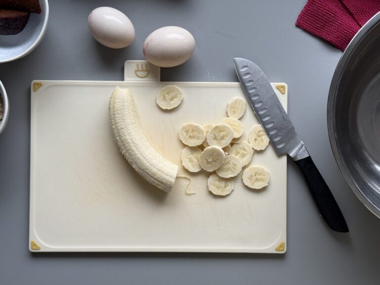 150 g Banane entsprechen 1 bis 2 Bananen, je nachdem wie groß sie sind. Die Bananen wird geschält und in dünnen Scheiben geschnitten, damit wir sie im Teig gut vermengen können.