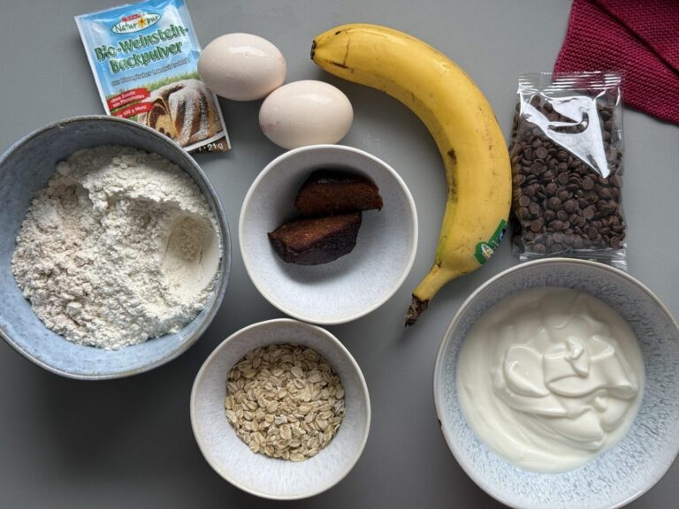 Dann bereiten wir alle Zutaten vor und wiegen sie ab. So geht es beim Backen gleich viel schneller und einfacher voran. Hier habe ich statt Heidelbeeren Schokoladen Stücken genommen. Und eine Dattelpaste verwendet, normale Datteln gehen natürlich auch. am besten die Sorte Medjool, die ist super saftig und süß.