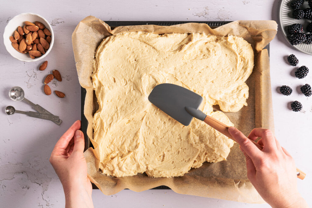 Den Rührteig gleichmäßig auf dem vorbereiteten Blech verteilen und glatt streichen.