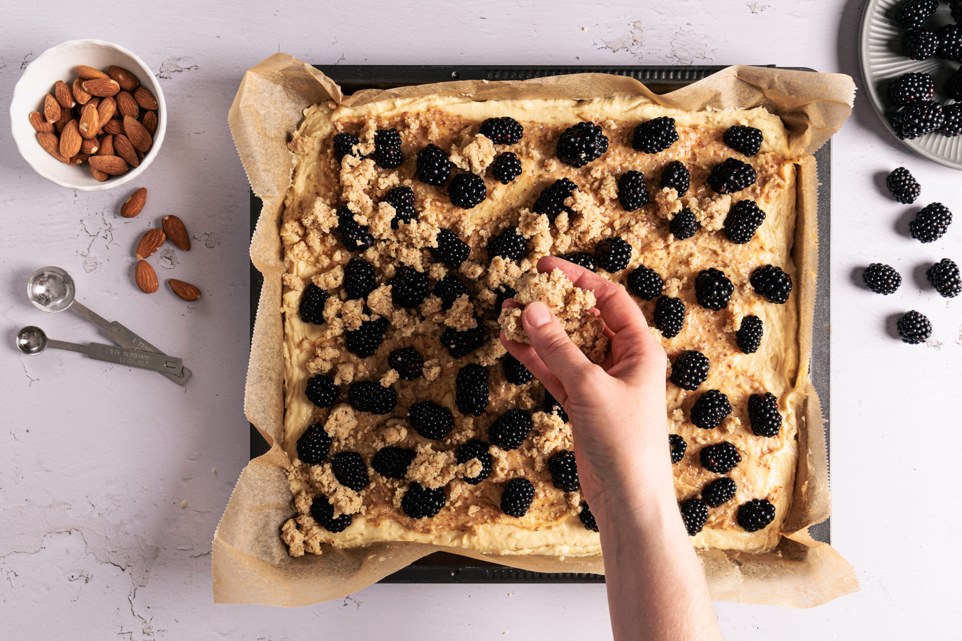 • Mandelschicht mit Frangipane: Die Mandelschicht aus Frangipane sorgt für eine feine Textur und verleiht dem Brombeerkuchen eine elegante Note.