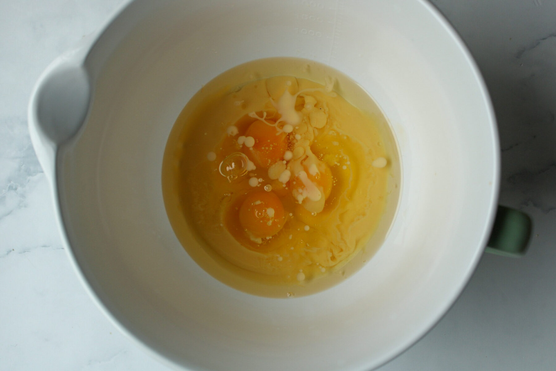 Gib die flüssigen Zutaten (Eierlikör, Öl und Eier) in eine Schüssel und verrühre diese miteinander