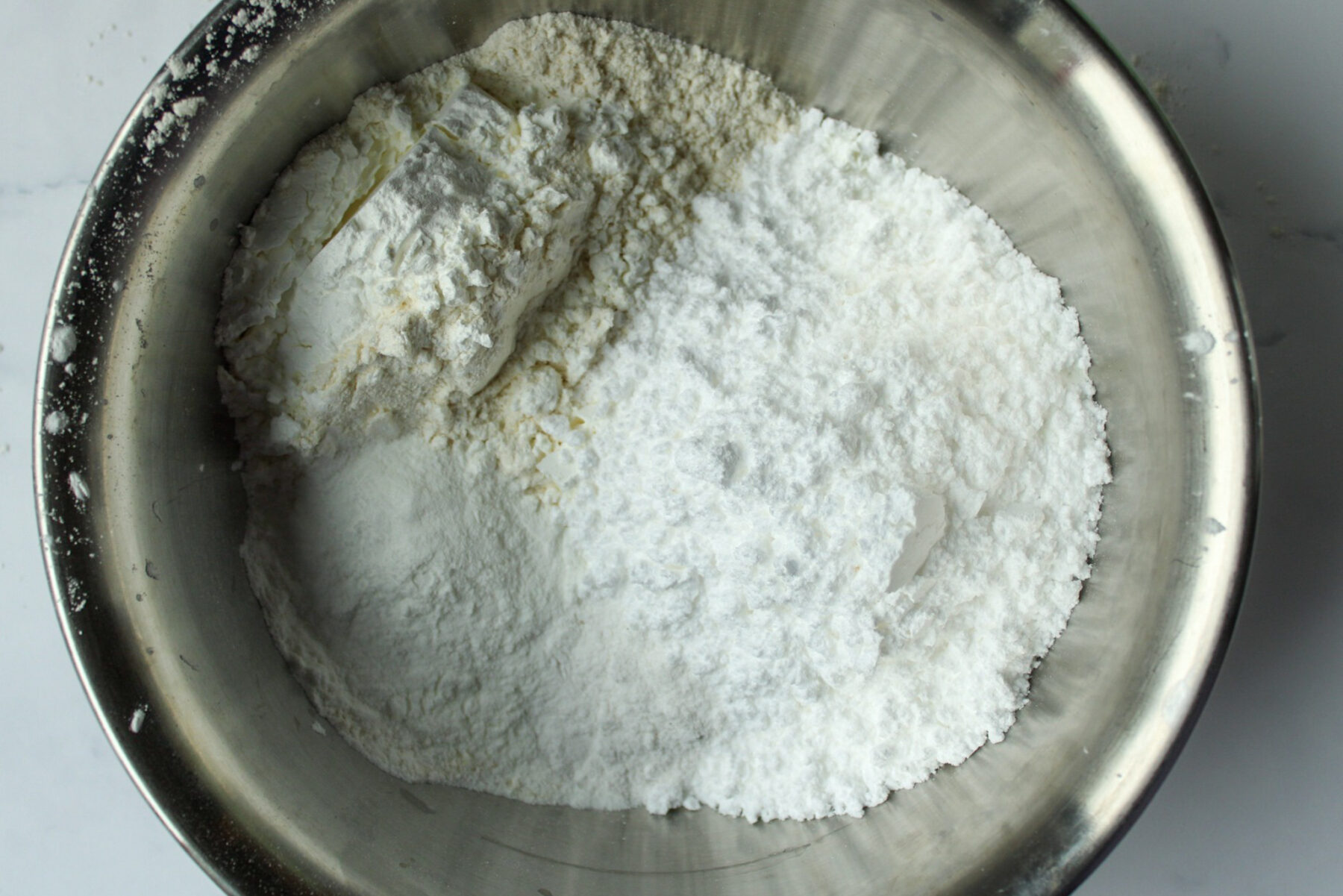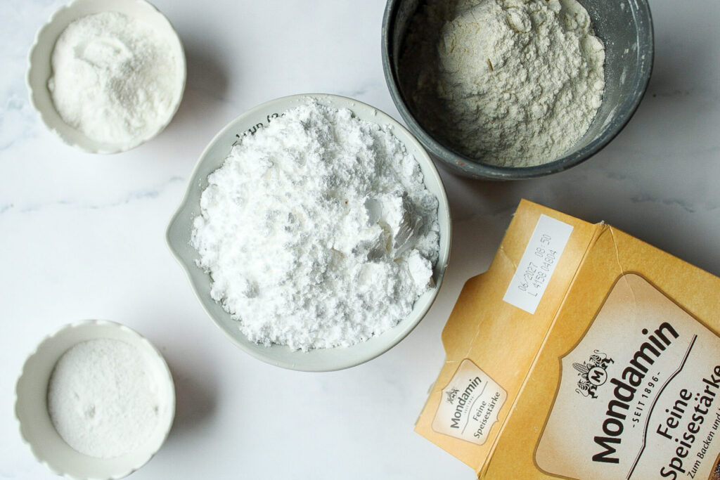 Nun nimmst Du Dir Das Mehl, die Stärke, Backpulver sowie Puderzucker und Vanillezucker zur Hand und gibst diese in eine extra Schüssel um sie kurz miteinander zu vermengen.