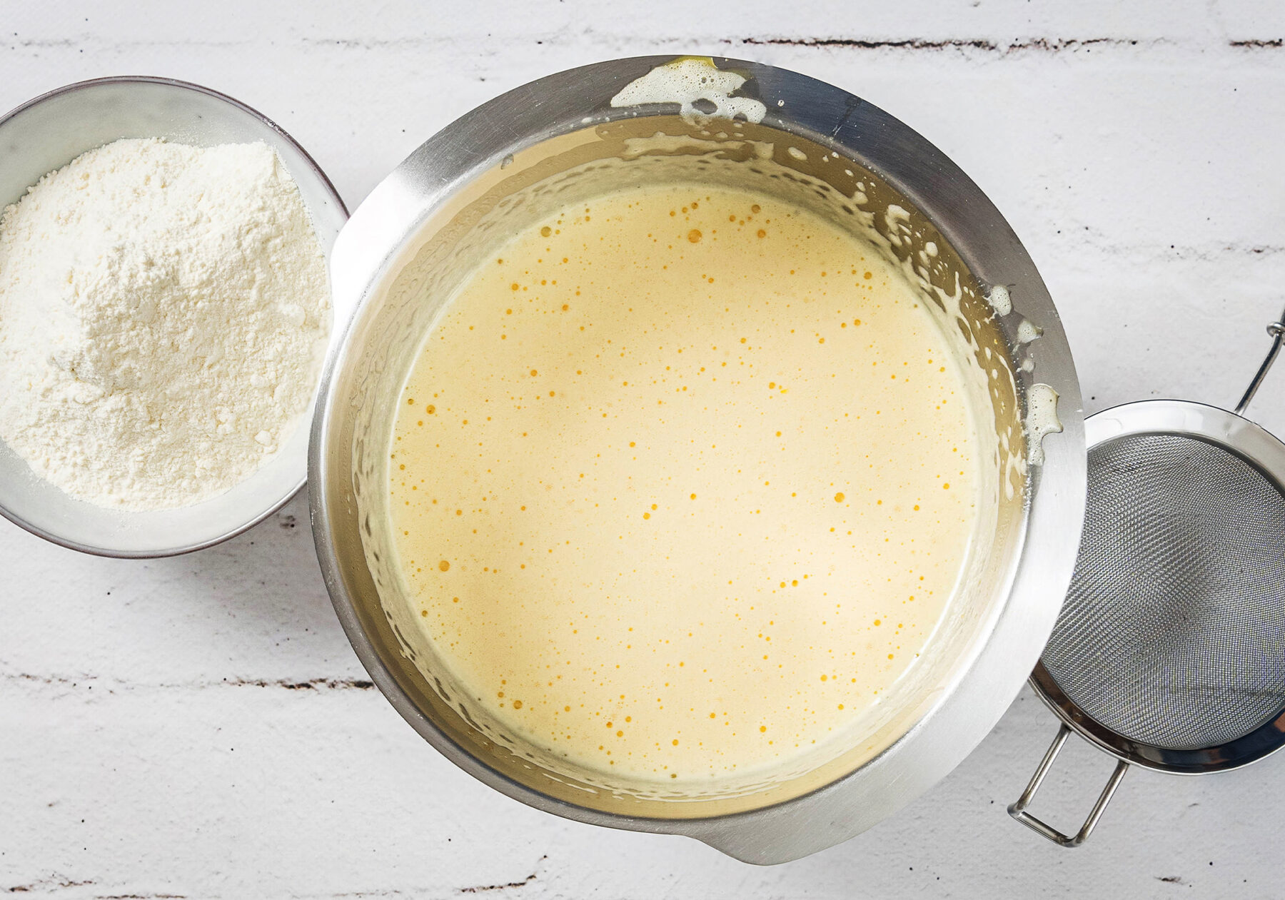 Anschließend das Mehl in die Eiermasse sieben und zügig aber gründlich unterheben, sodass weder Mehlnester im Teig entstehen noch die eingeschlagene Luft entweichen kann.