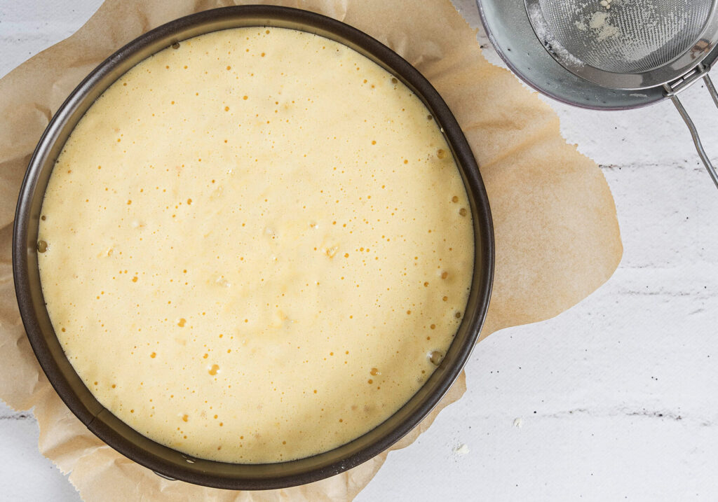 Zur Vorbereitung den Backofen auf 190 Grad Ober- und Unterhitze vorheizen. Das ist wichtig, damit der Biskuit für deine einfache Zitronentorte später gleichmäßig backen kann. Während der Ofen vorheizt, den Boden einer 26 cm Springform mit Backpapier auslegen. Es ist dabei wichtig, nur den Boden zu bedecken und die Form nicht einzufetten, da der Biskuit sonst an den Rändern nicht aufgehen könnte. Wenn der Teig an den Rändern der Form haften bleibt, kann er gleichmäßig hochsteigen, was für einen lockeren Biskuit entscheidend ist.