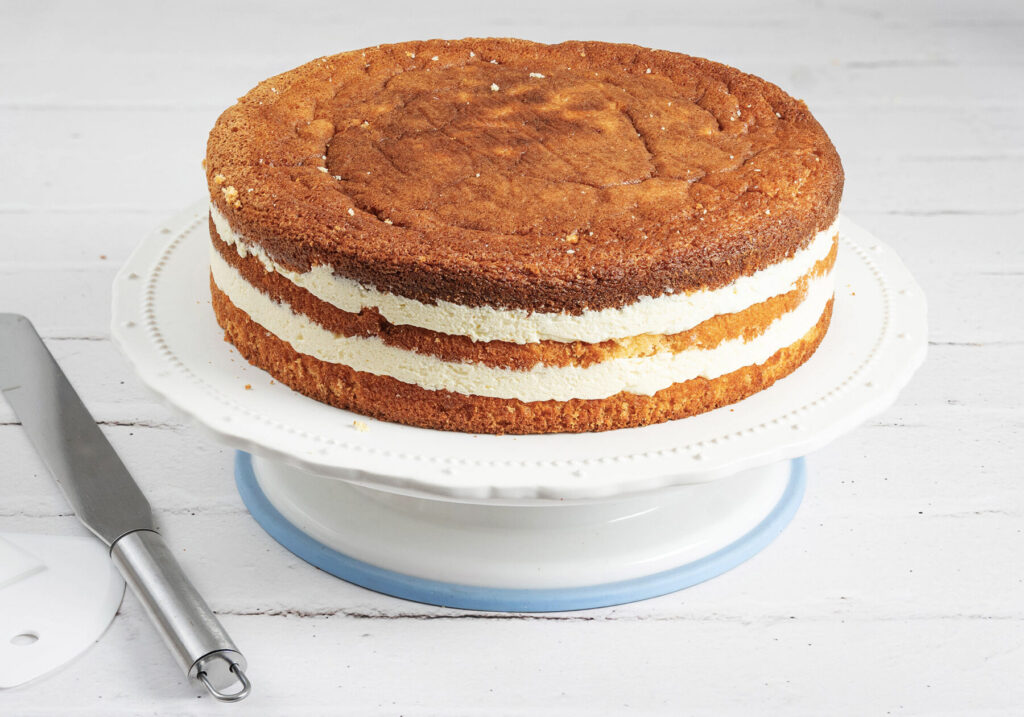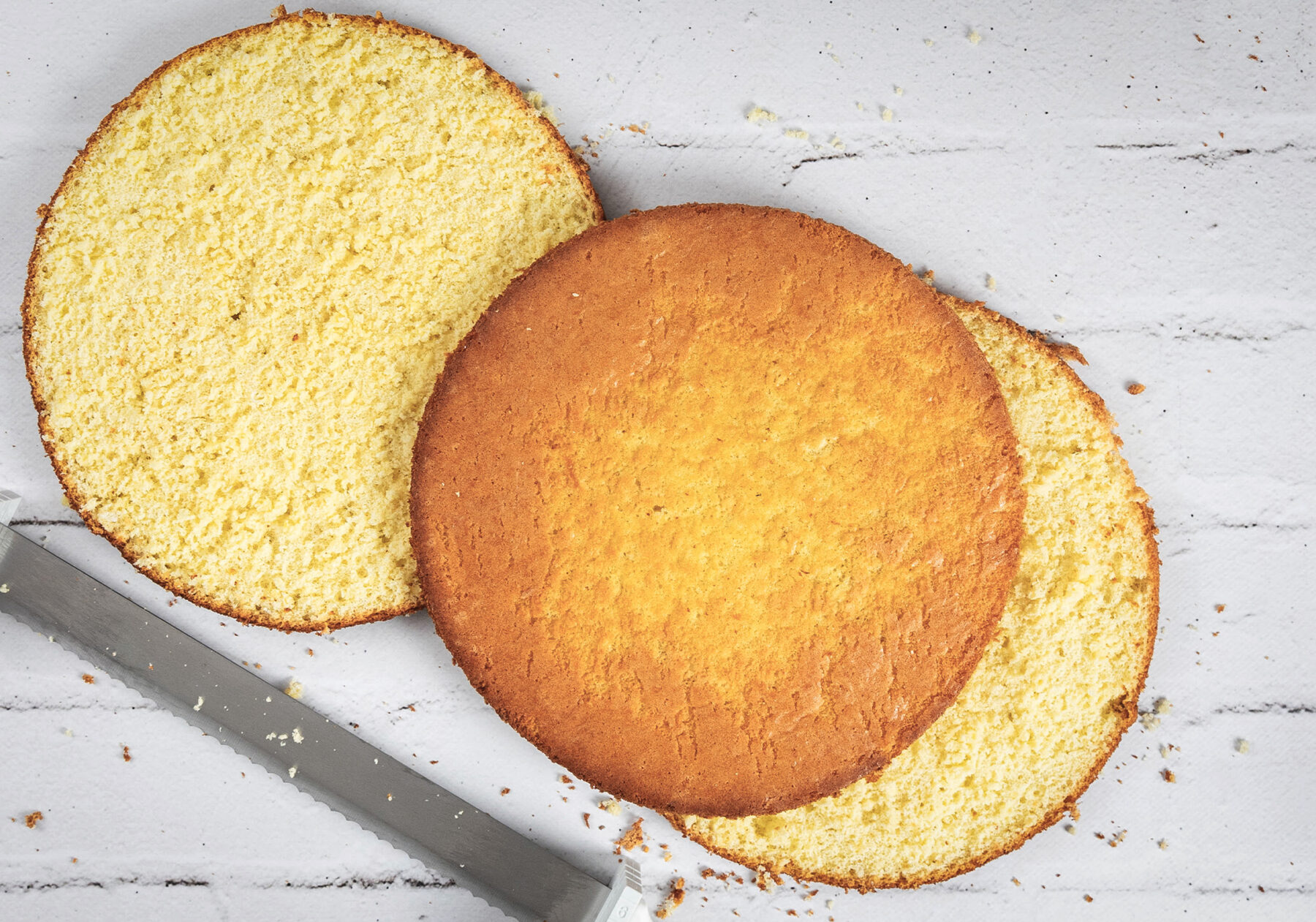 Kurz vor dem Zusammenstellen der einfachen Zitronentorte wird der abgekühlte Biskuitboden in drei gleichmäßige Schichten geteilt. Dafür eignet sich ein Tortenbodenschneider besonders gut, da er es ermöglicht, die Böden präzise und gleichmäßig zu schneiden. Sobald der Biskuit vollständig abgekühlt ist, setzt man den Tortenbodenschneider an der Seite des Kuchens an und zieht ihn gleichmäßig durch den Boden, ohne dabei zu viel Druck auszuüben.
