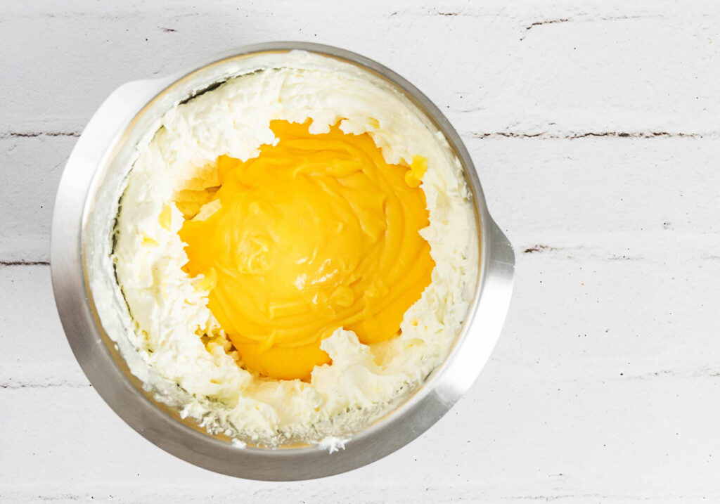 Tipp: Um sicherzustellen, dass die Creme stabil bleibt, solltest du nicht zu kräftig rühren, sondern lieber in langsamen, gleichmäßigen Bewegungen das Lemon Curd integrieren. So bleibt die Creme leicht und fluffig und hat dennoch eine angenehme Festigkeit.
