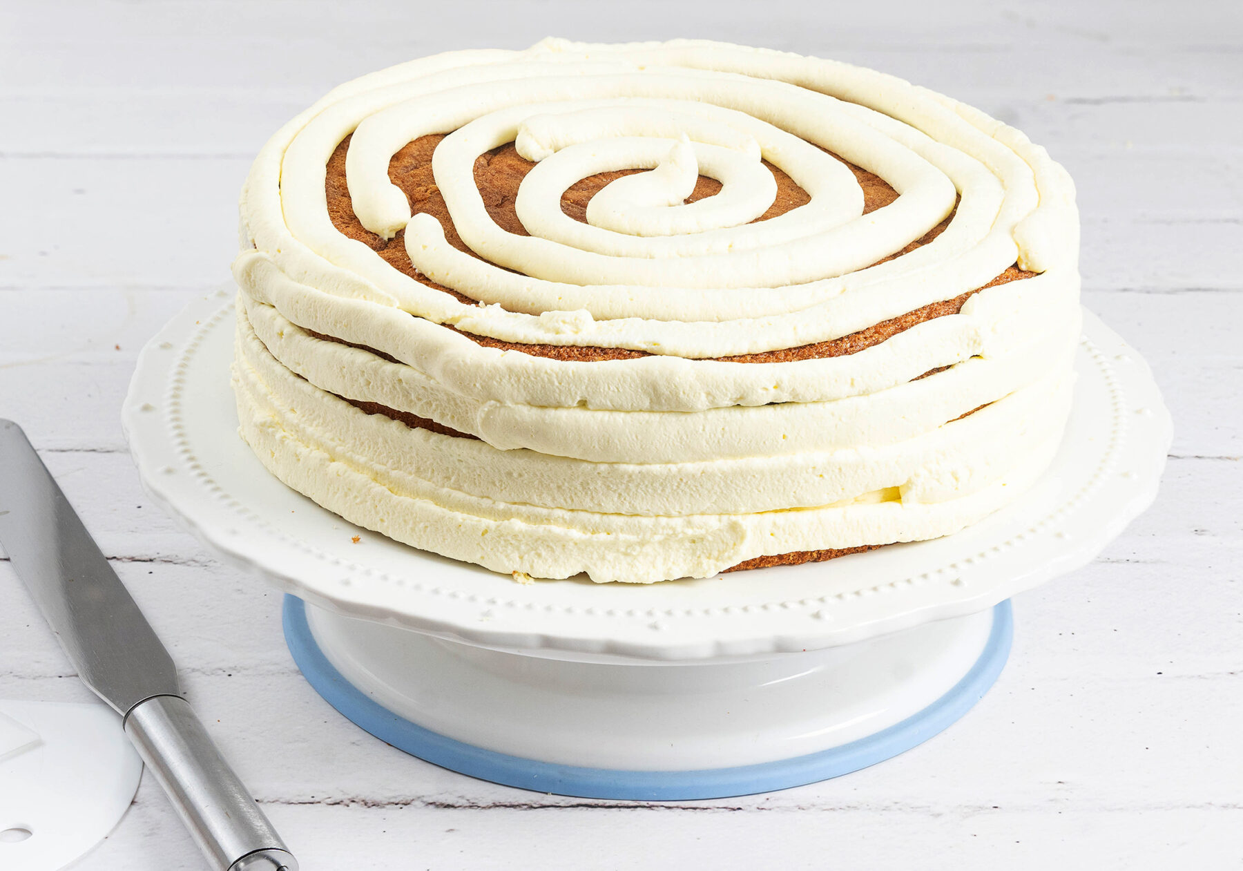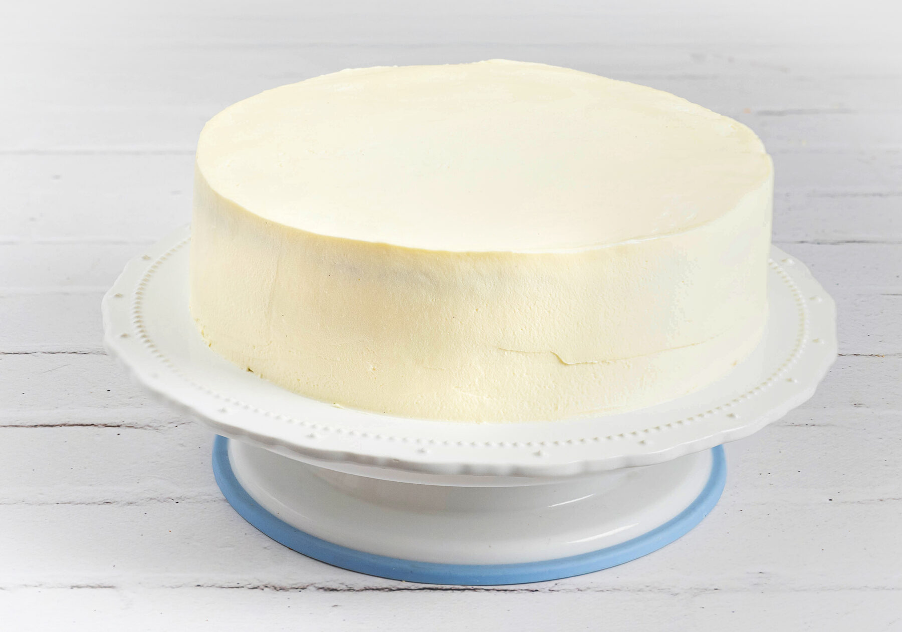 Tipp: Für eine besonders glatte Oberfläche kannst du einen Teigspatel aus Metall verwenden und ihn kurz mit einem Fön erwärmen. Die leicht erwärmte Metallkante hilft, die Creme noch glatter zu streichen, da sie leicht anschmilzt und sich dadurch geschmeidiger verteilen lässt. Achte darauf, den Spatel nicht zu heiß werden zu lassen – eine leichte Erwärmung reicht aus, um ein perfektes, glattes Finish zu erzielen.