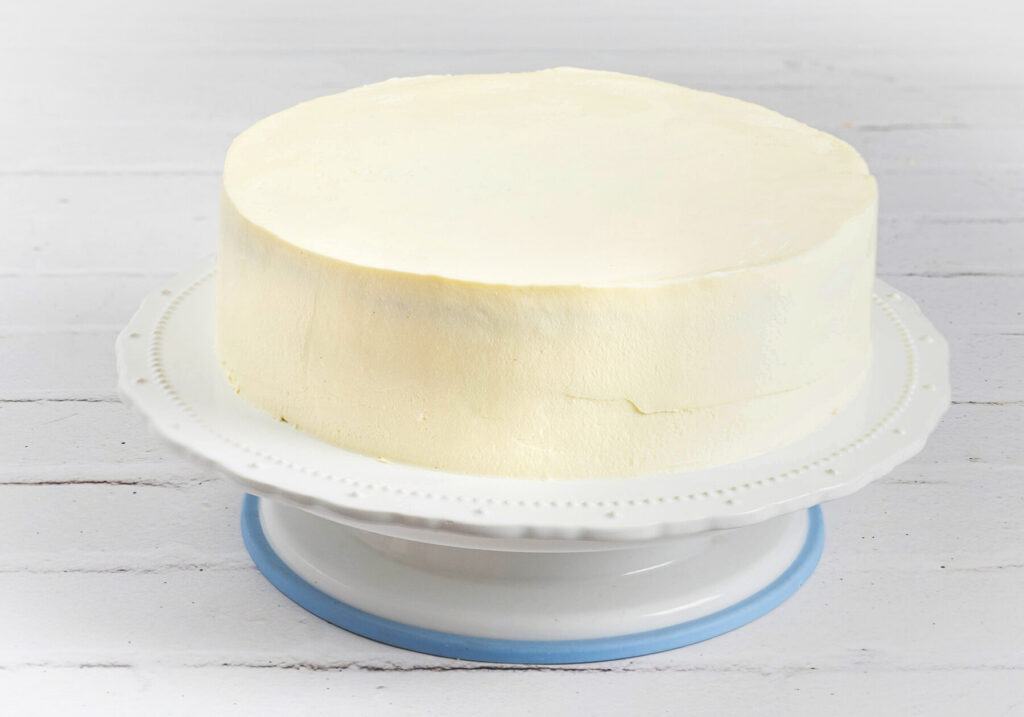 Nachdem die Creme aufgetragen ist, wird sie mithilfe einer Palette oder eines Teigspatels glatt gestrichen. Hierbei hilft der Drehteller wieder: Drehe die Torte langsam, während du die Palette flach an der Seite anlegst und die Creme sanft glattziehst. Dies sorgt für eine gleichmäßige, glatte Oberfläche. Dasselbe machst du mit der Oberseite der Torte. Es kann hilfreich sein, den Spatel leicht im Winkel zu halten und mit sanftem Druck zu arbeiten, um die Creme gleichmäßig zu verteilen und eine glatte, saubere Oberfläche zu erhalten.
