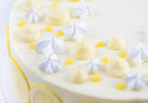 Lemon Curd-Tropfen: Um die Torte noch frischer und fruchtiger wirken zu lassen, kannst du kleine Tropfen des Lemon Curd auf die Oberfläche der Torte setzen. Verwende einen Teelöffel oder einen kleinen Spritzbeutel, um kleine, gleichmäßige Punkte oder Tropfen zu setzen. Du kannst diese zwischen die Baisertupfen oder die Cremetupfen platzieren, um einen schönen Kontrast in Farbe und Geschmack zu erzielen.