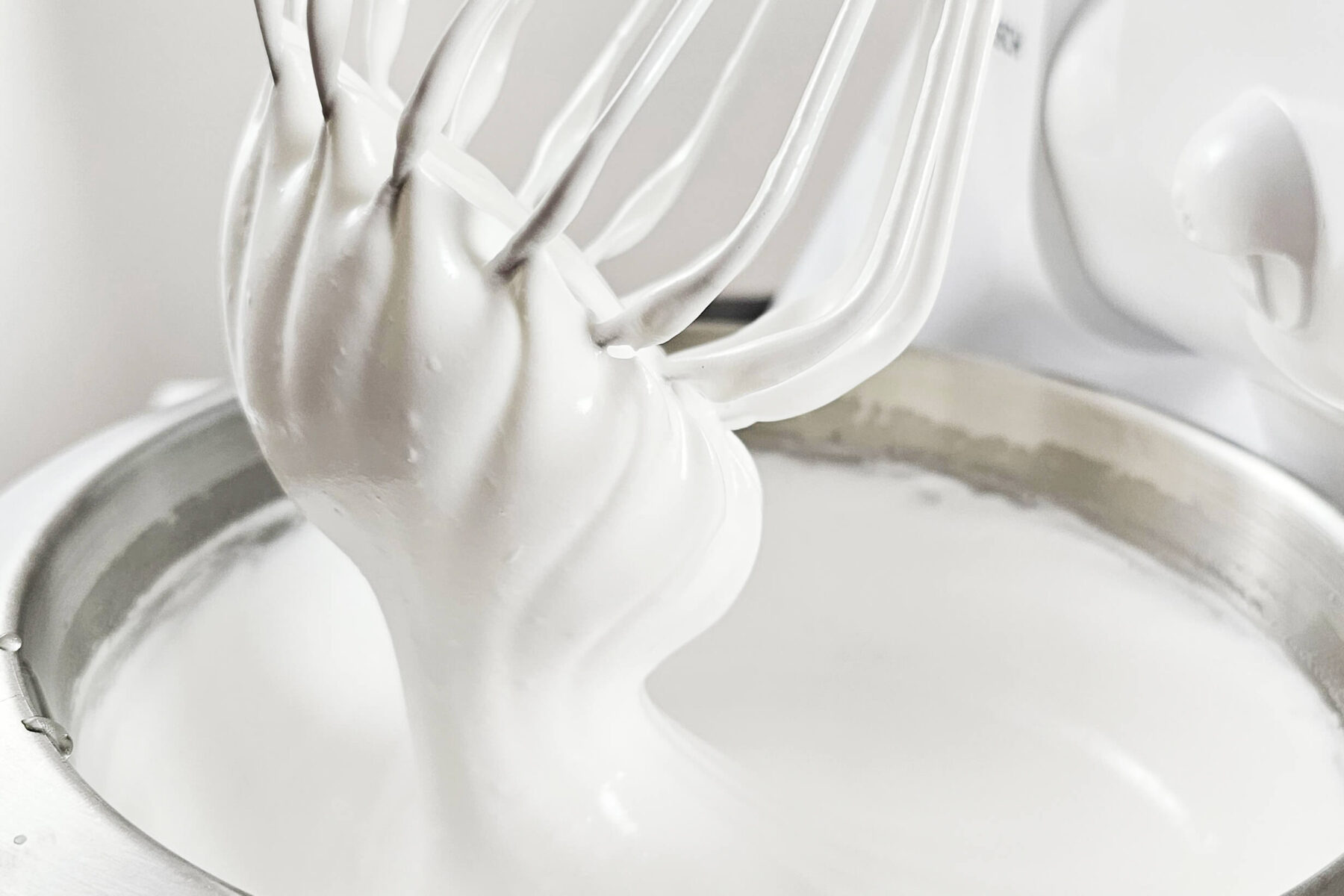 Hat deine Eiermasse 45 Grad erreicht, beginnst du damit alles in der Küchenmaschine kaltzuschlagen. Wie lange du dafür benötigst, ist abhängig vom Modell deiner Küchenmaschine oder deines Handrührgerätes. Achte deshalb nicht auf die Zeit sondern auf die Konsistenz deiner Eiermasse. Diese ist richtig sobald durch die Drehbewegung des Schneebesen gut sichtbare Ringe auf der Oberfläche entstehen. Alternativ dazu kannst du auch mit der Fingerprobe testen, ob die Masse fertig ist. Tauche dafür deinen Finger ein, es entsteht ein kleiner Haken an der Unterseite der nicht abtropfen darf.