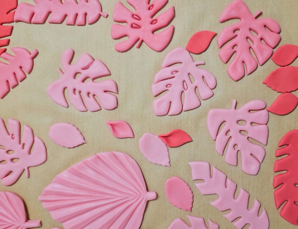 • Blütenpaste einfärben, in Formen drücken, Blätter ausstechen, trocknen lassen.