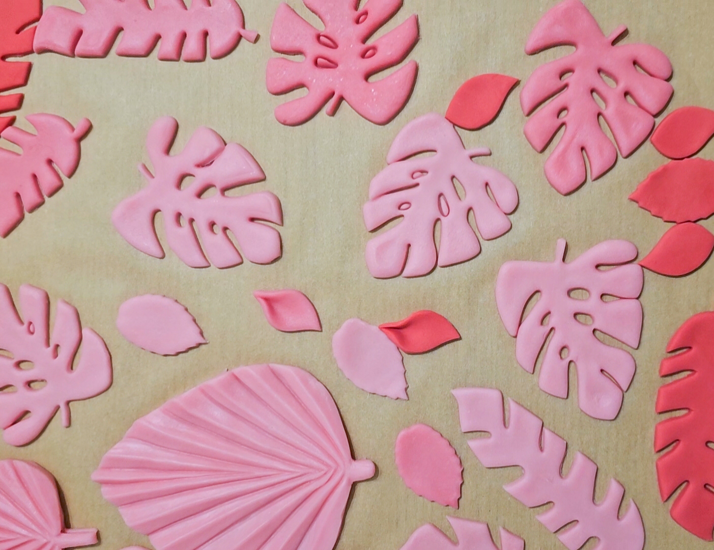 Drücke deine eingefärbte Blütenpaste anschließend portionsweise in die passende Palmblatt-Silikonform, nimm sie vorsichtig heraus und glätte die Ränder. Drücke anschließend vorsichtig Cake Pop - Stiele in die Unterseite der Blätter. Für zusätzliche Blätterformen kannst du deine eingefärbte Blütenpaste dünn ausrollen und mithilfe von Ausstechformen weitere Blätter ausstechen, die später auf der Außenseite der Torte angebracht werden.