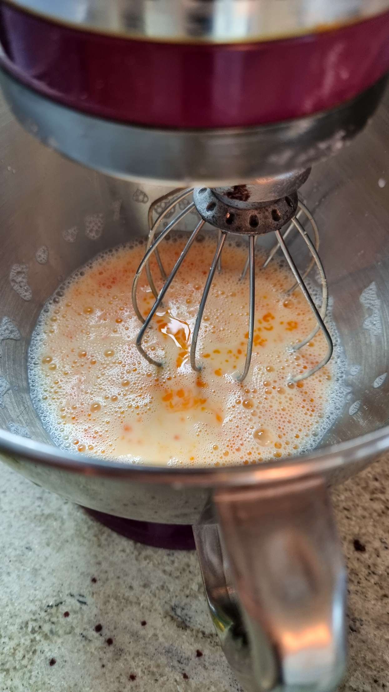 In einer Rührmaschine schlägst du die Eier kurz an, gibst die Milch dazu und rührst dann Mehl und Backpulver kurz unter.