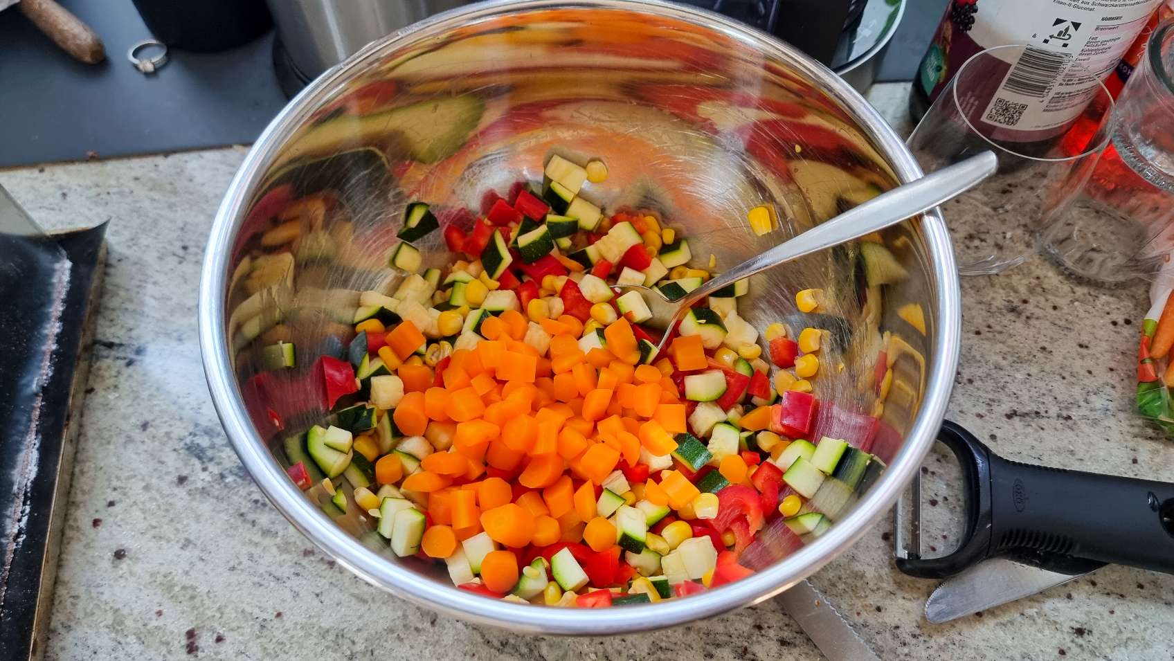 TIPP: je nach Gemüseart würde ich manches auch kurz in kochendes Wasser legen. Karotten zum Beispiel gare ich immer kurz vor, Erbsen oder Blumenkohl auch. Zucchini, Paprika oder Mais aus der Dose nicht.