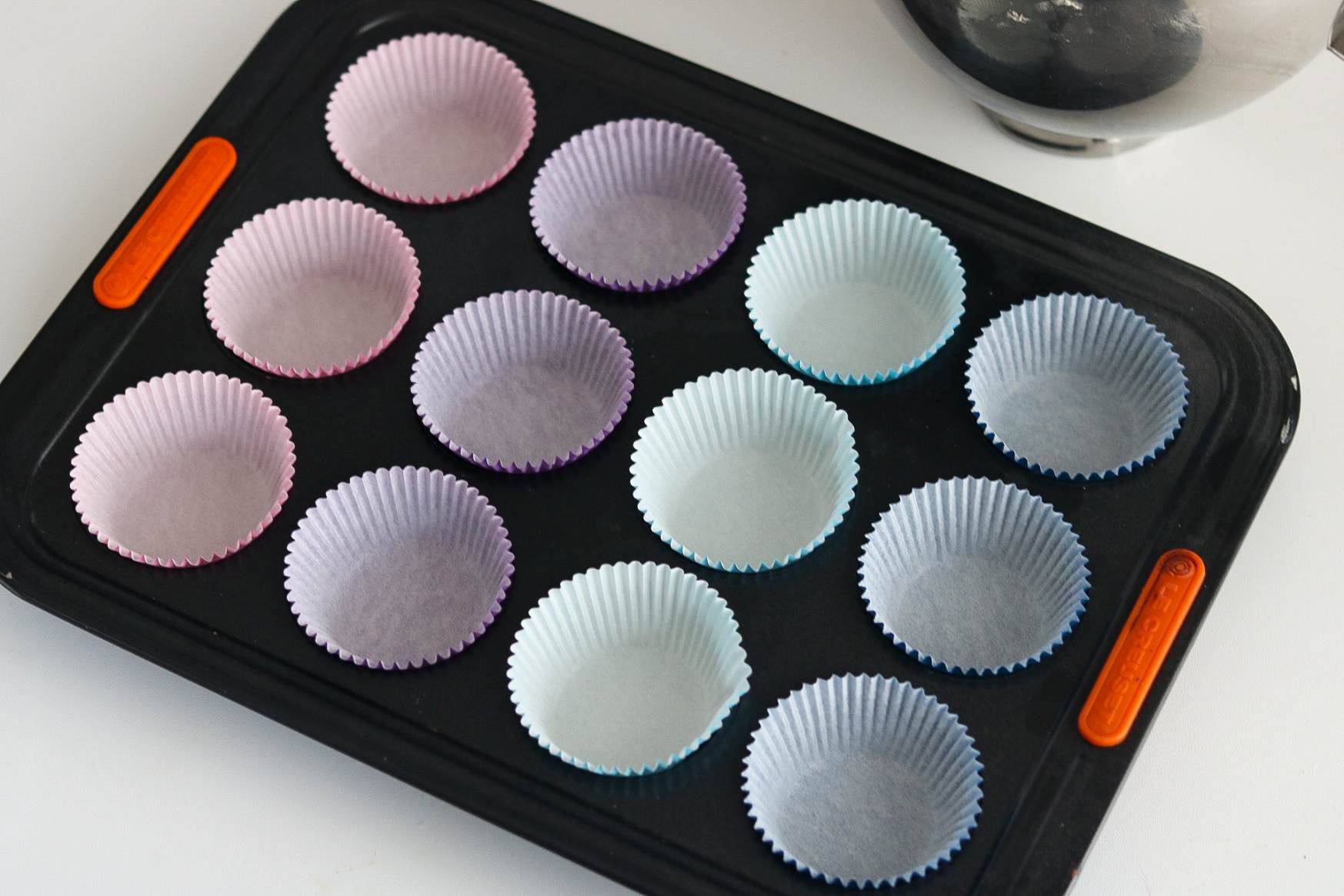 Und damit auch wirklich alles parat ist, bereite ich das Muffin Blech auch gleich vor. Dafür lege ich das Blech bereits mit den Papierförmchen aus. So muss man, wenn der Teig fertig angerührt ist, nur noch die Mulden befüllen.