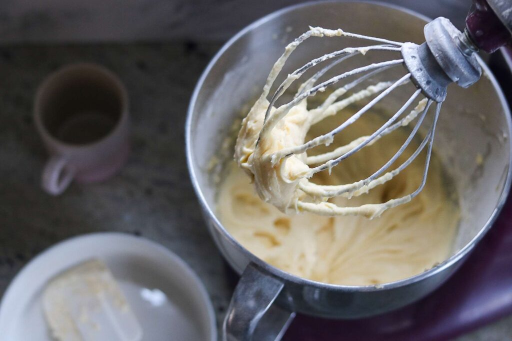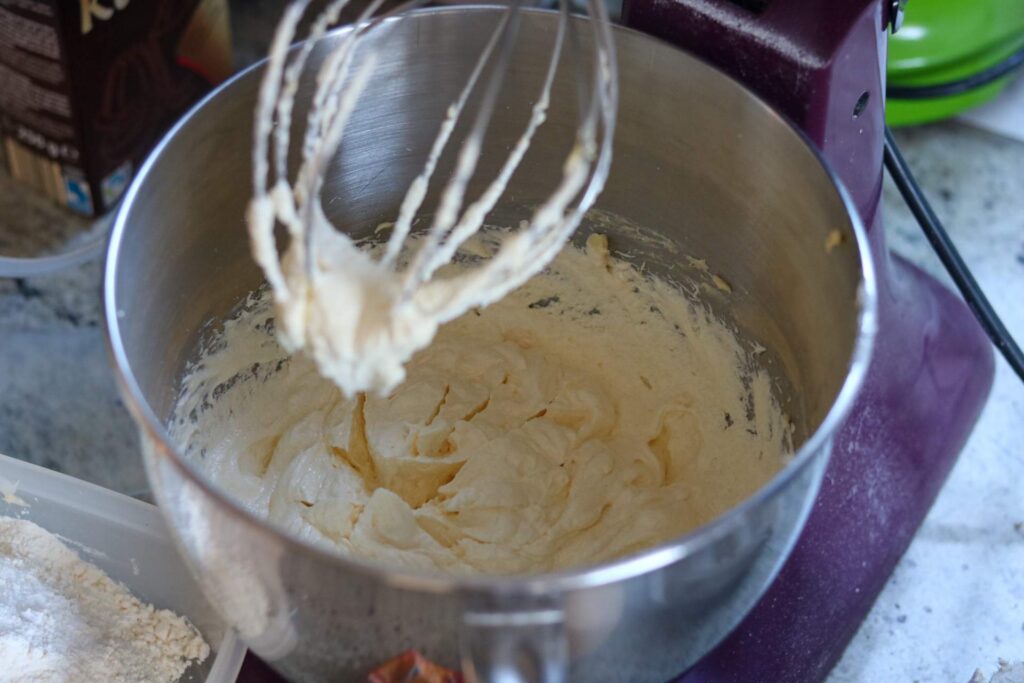 Als erstes wird  die Margarine kräftig aufgeschlagen, so dass die Masse schön weich und leicht weiß wird.